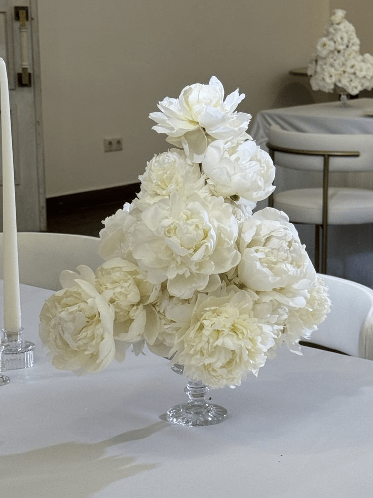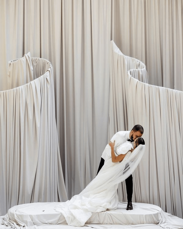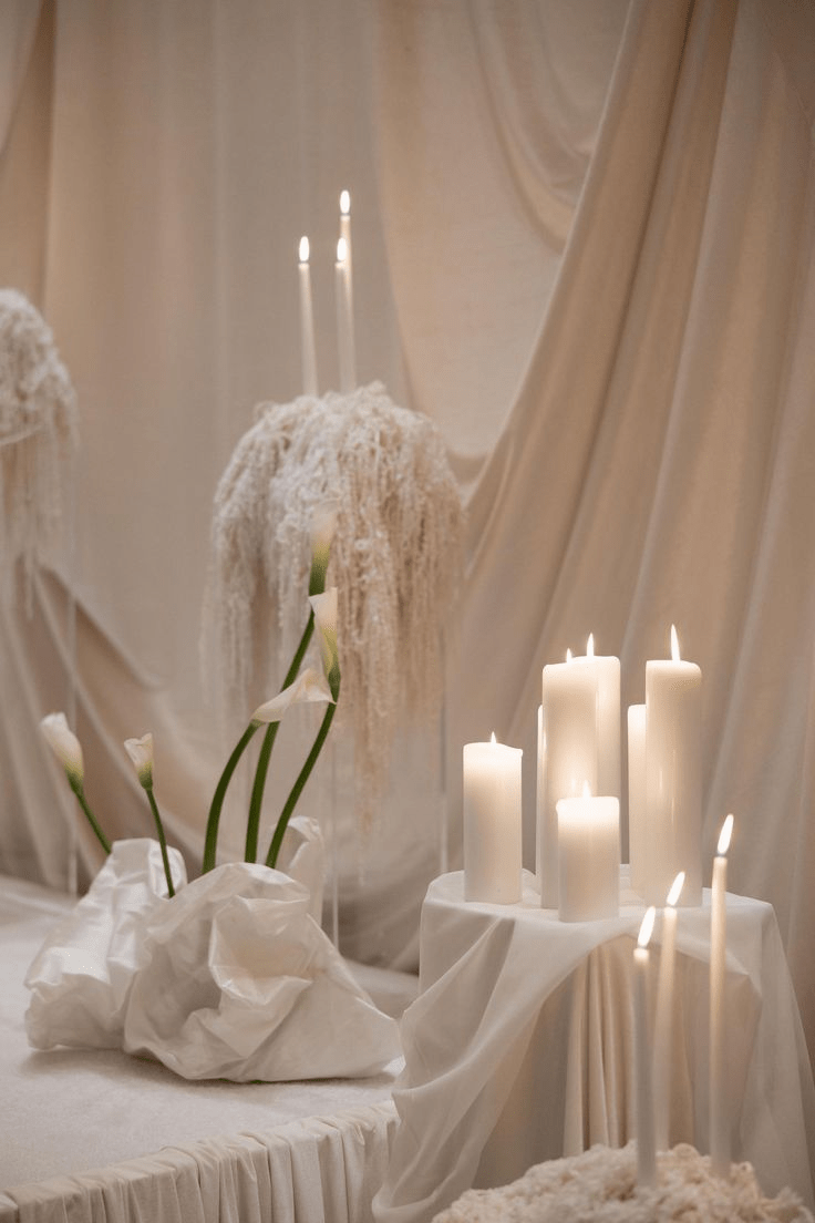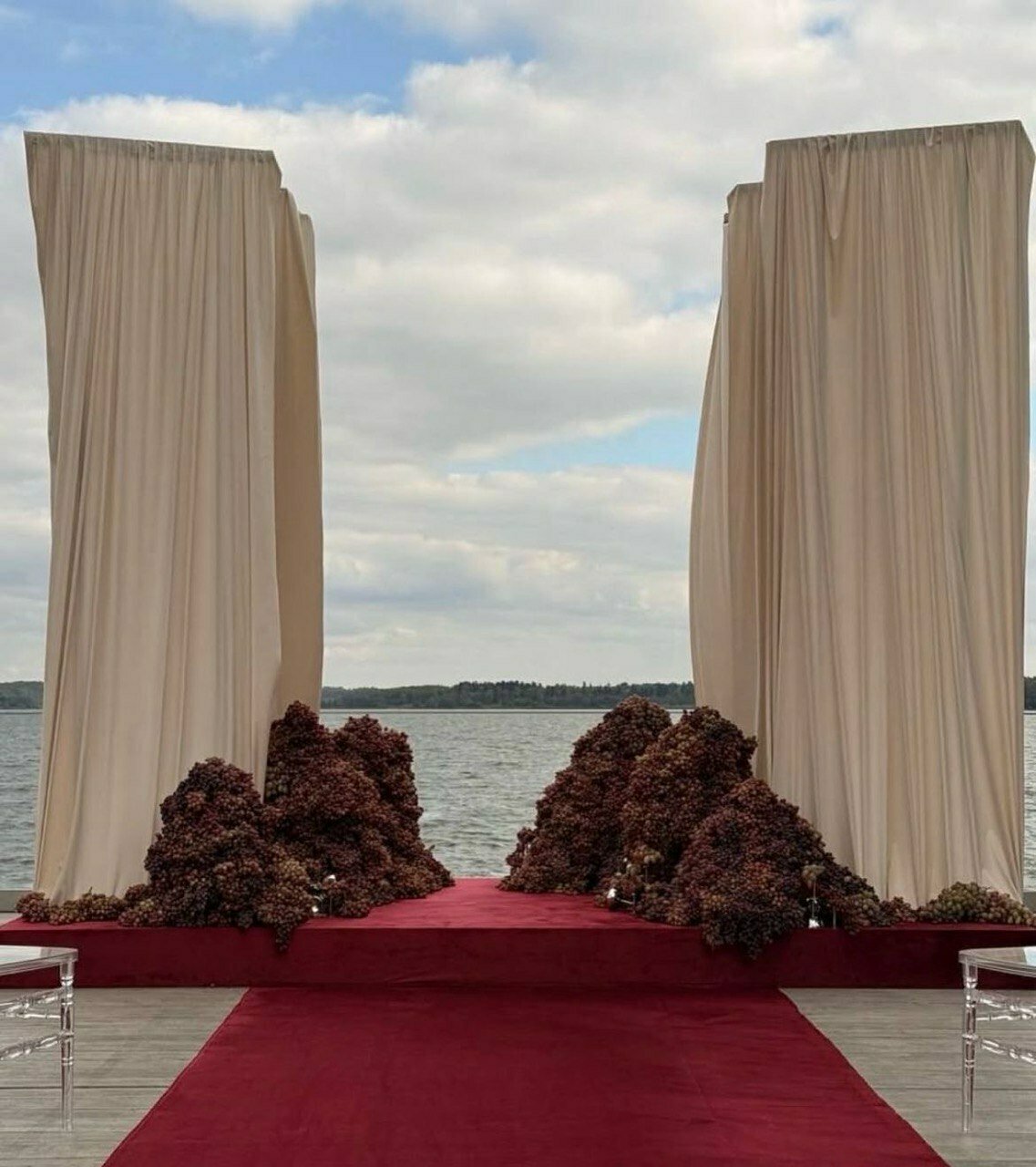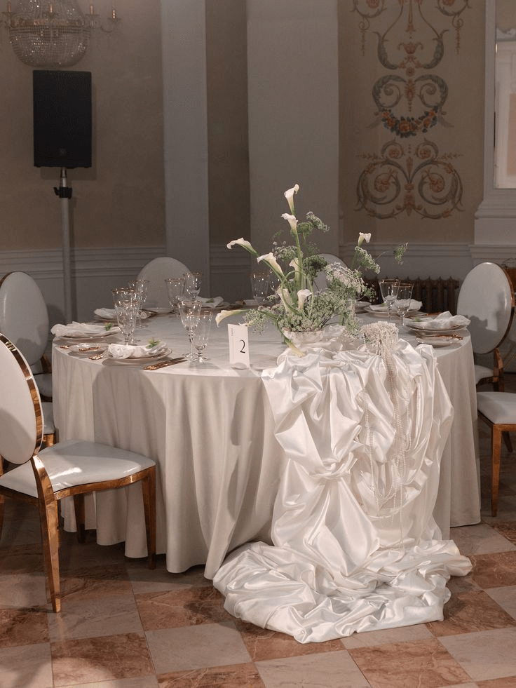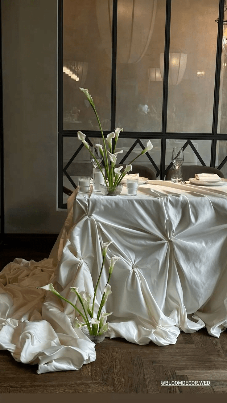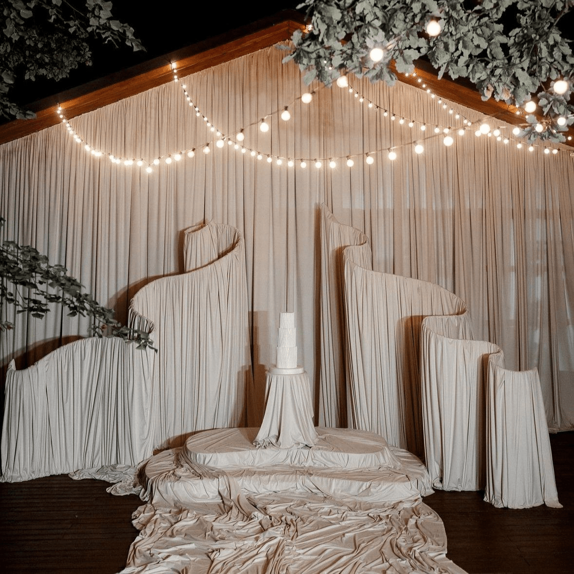 Розкішна тканина з легким блиском, драпірована підбірками, щоб було вільно та легко, повітряно. Понизу композиції купчасті у білих вазах чи без ваз на подіумі.