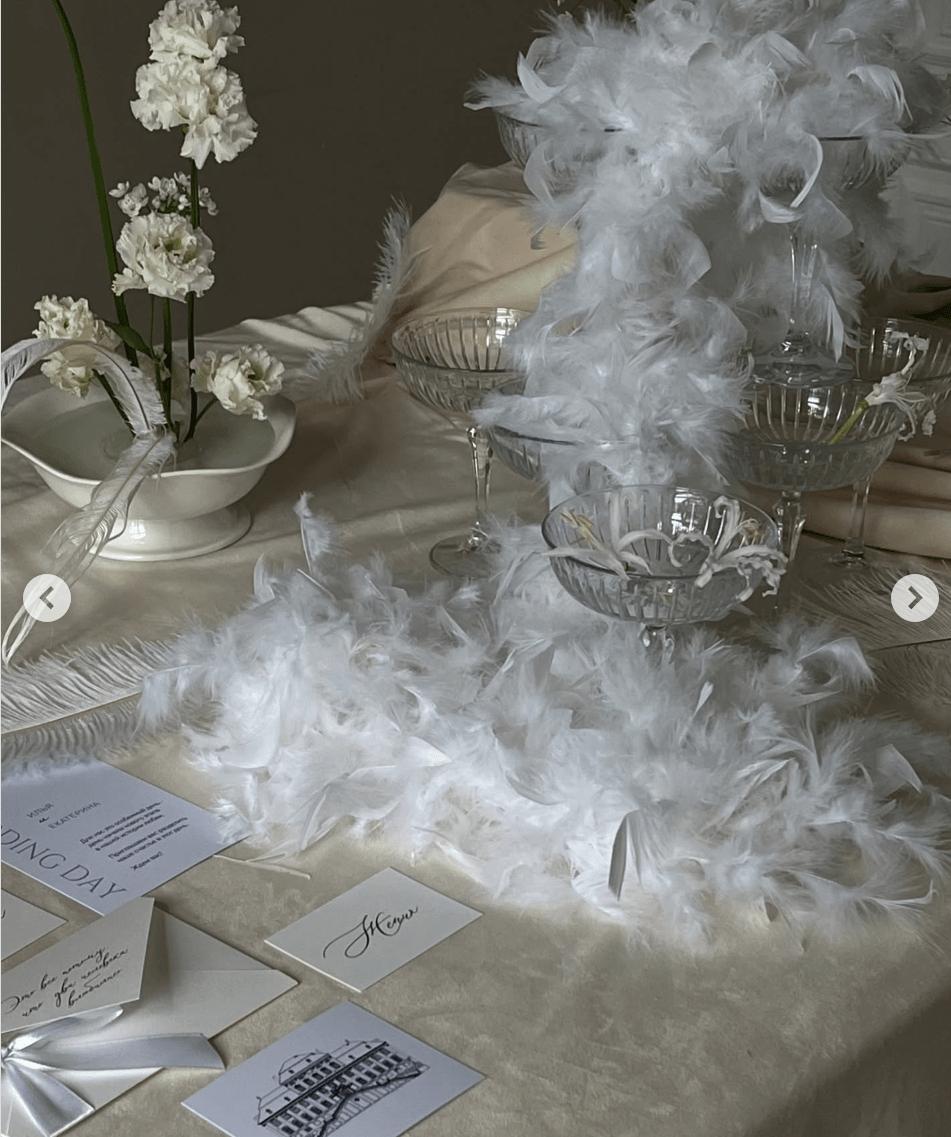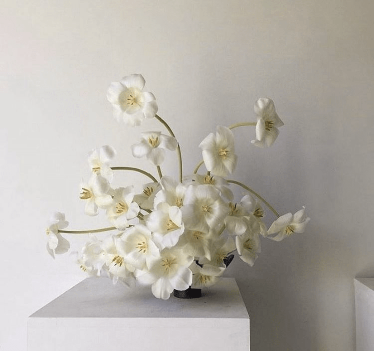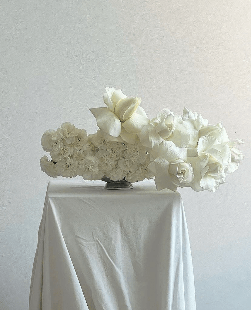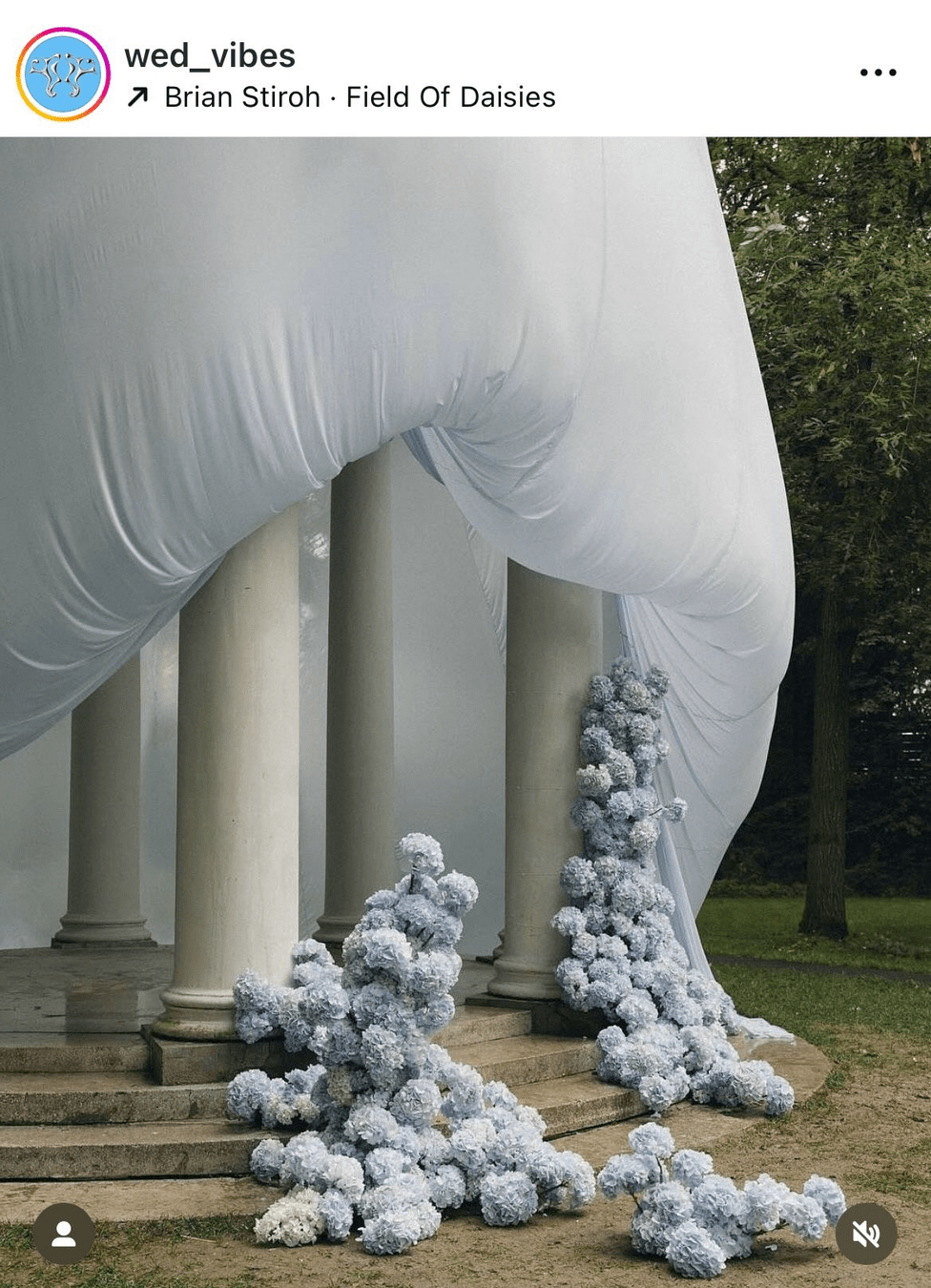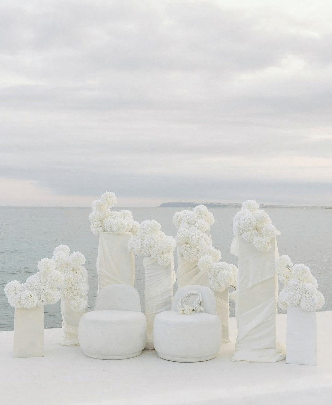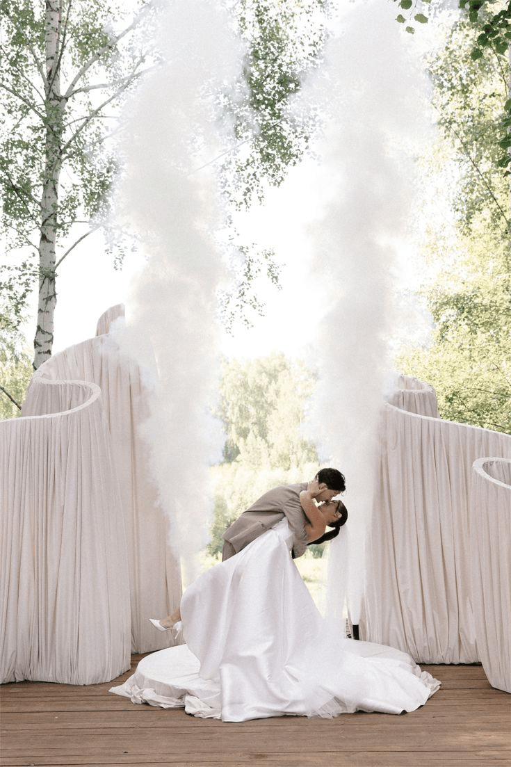 Розкішна тканина з легким блиском, драпірована підбірками, щоб було вільно та легко, повітряно. Понизу композиції купчасті у білих вазах чи без ваз на подіумі.