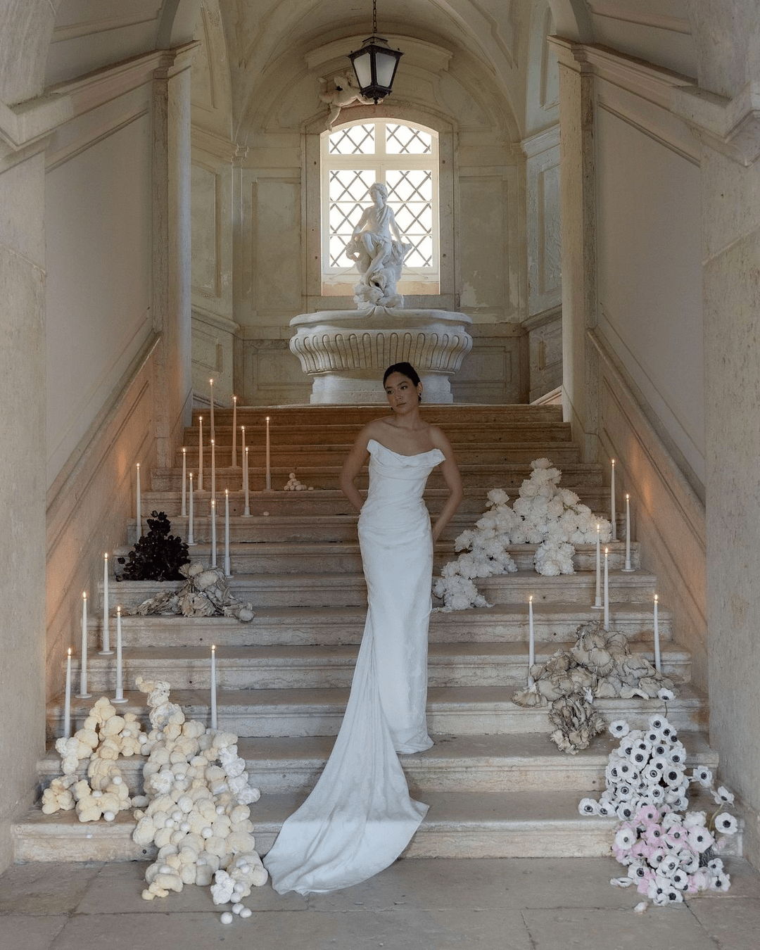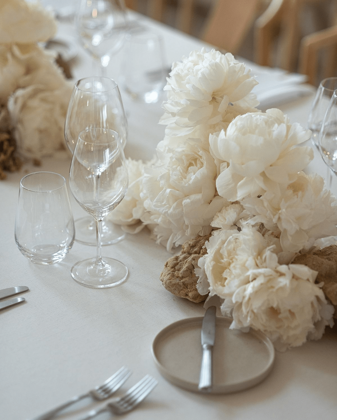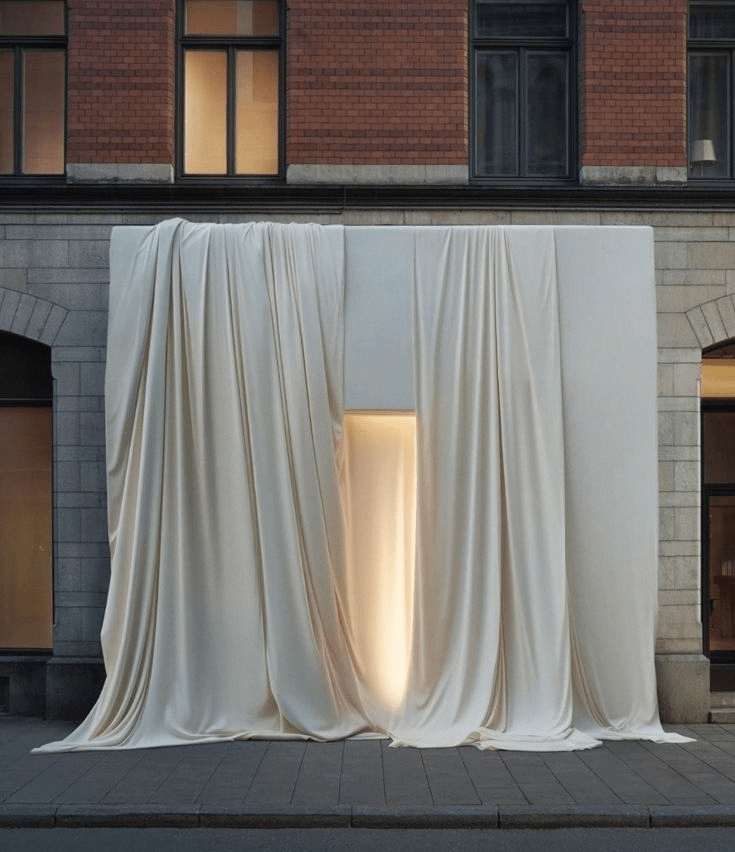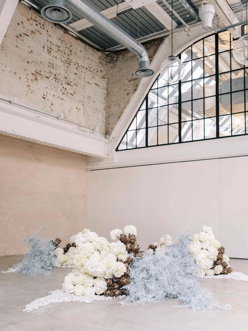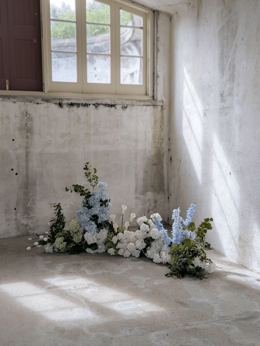 Розкішна тканина з легким блиском, драпірована підбірками, щоб було вільно та легко, повітряно. Понизу композиції купчасті у білих вазах чи без ваз на подіумі.