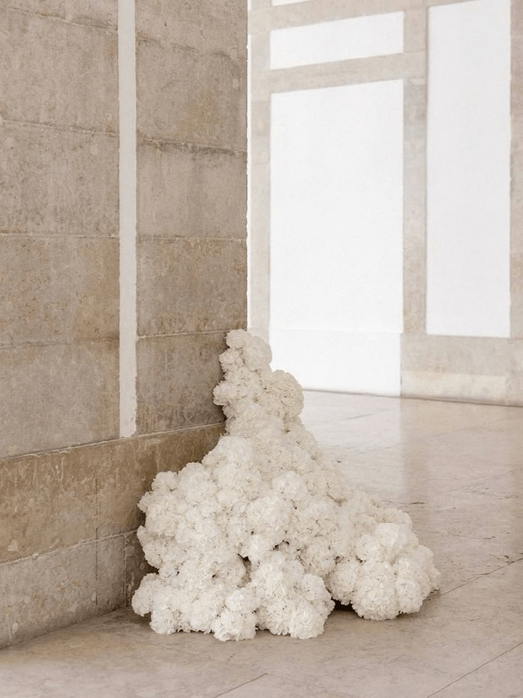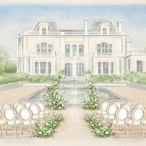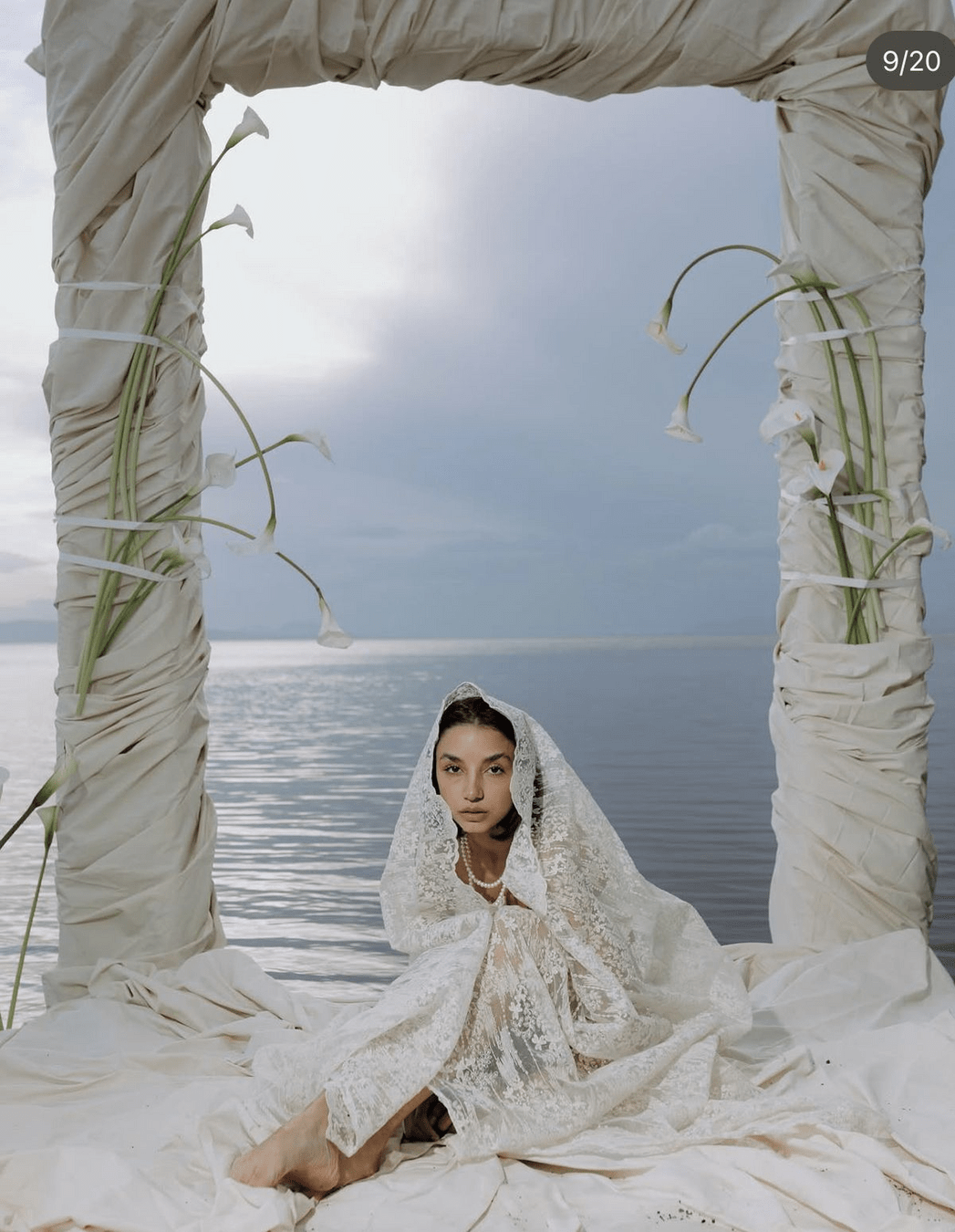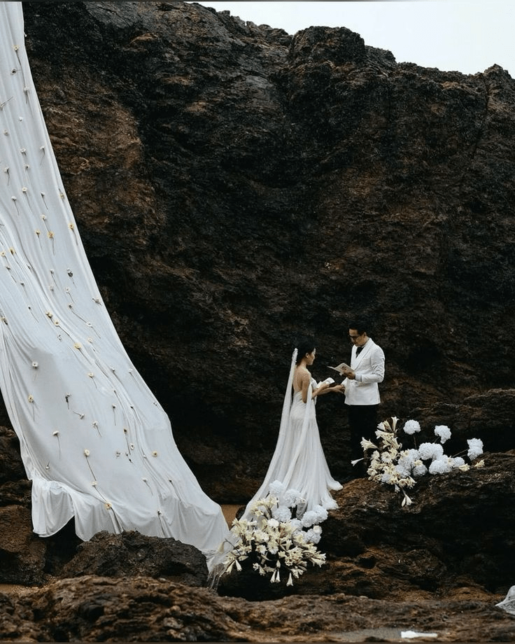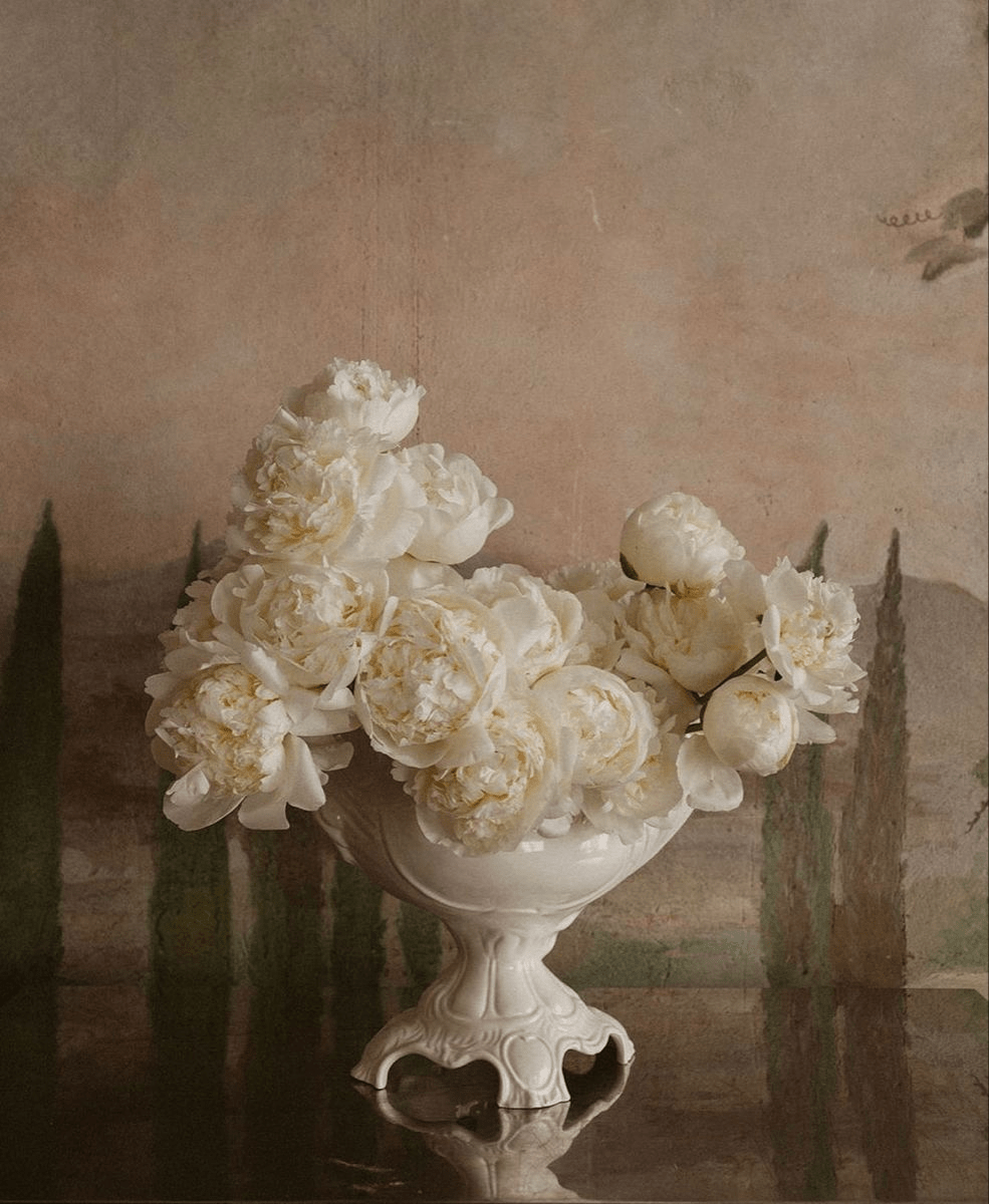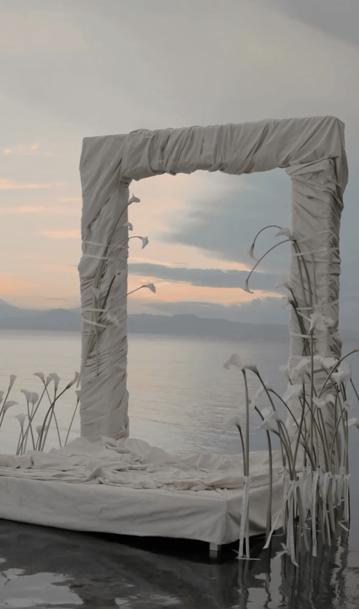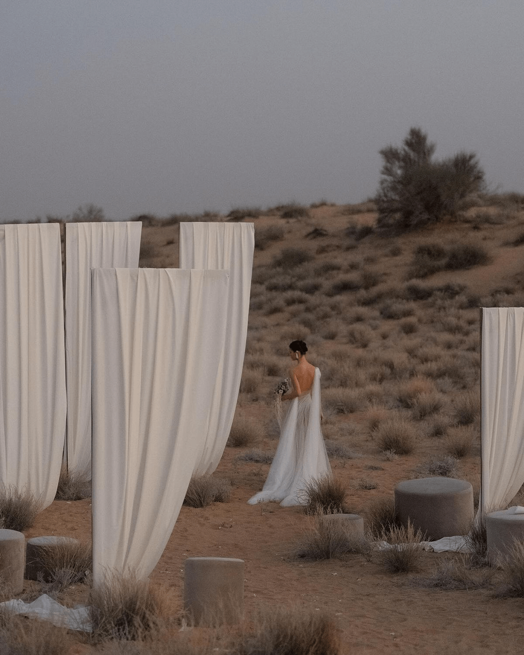 Розкішна тканина з легким блиском, драпірована підбірками, щоб було вільно та легко, повітряно. Понизу композиції купчасті у білих вазах чи без ваз на подіумі.