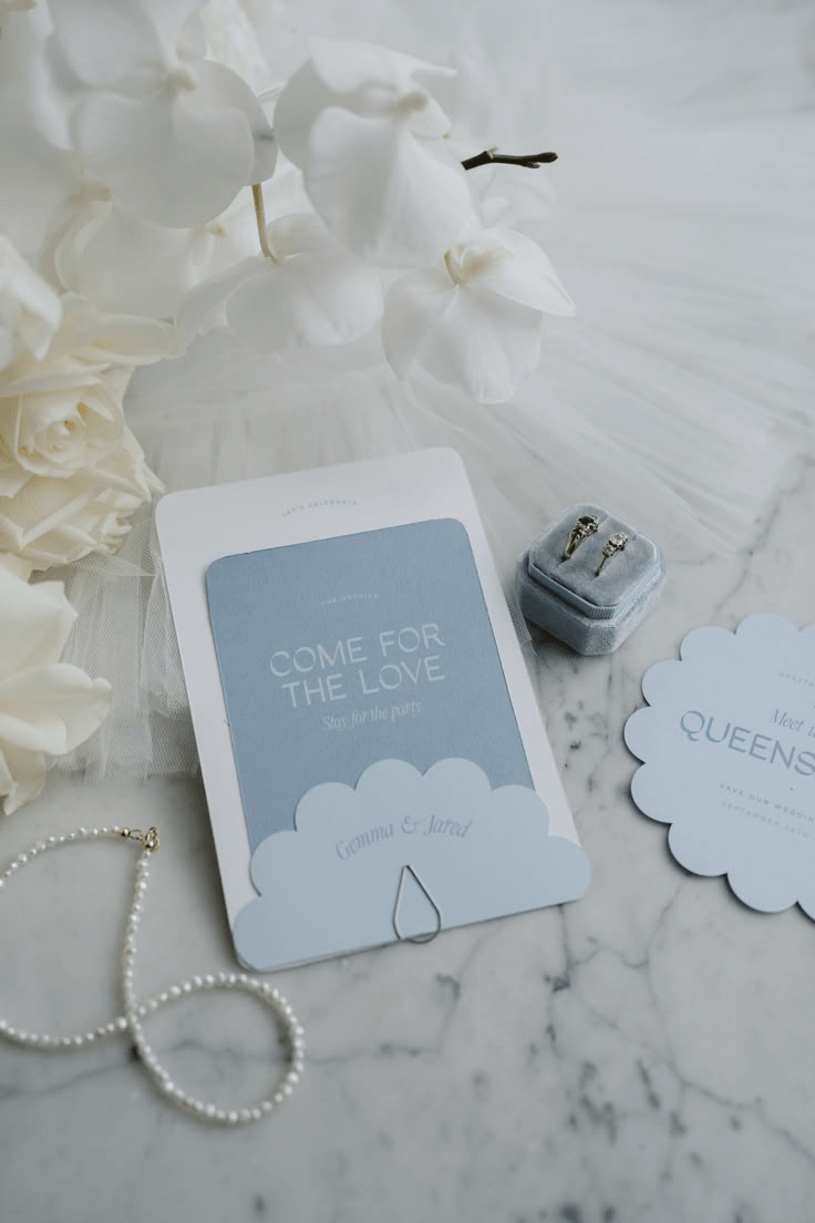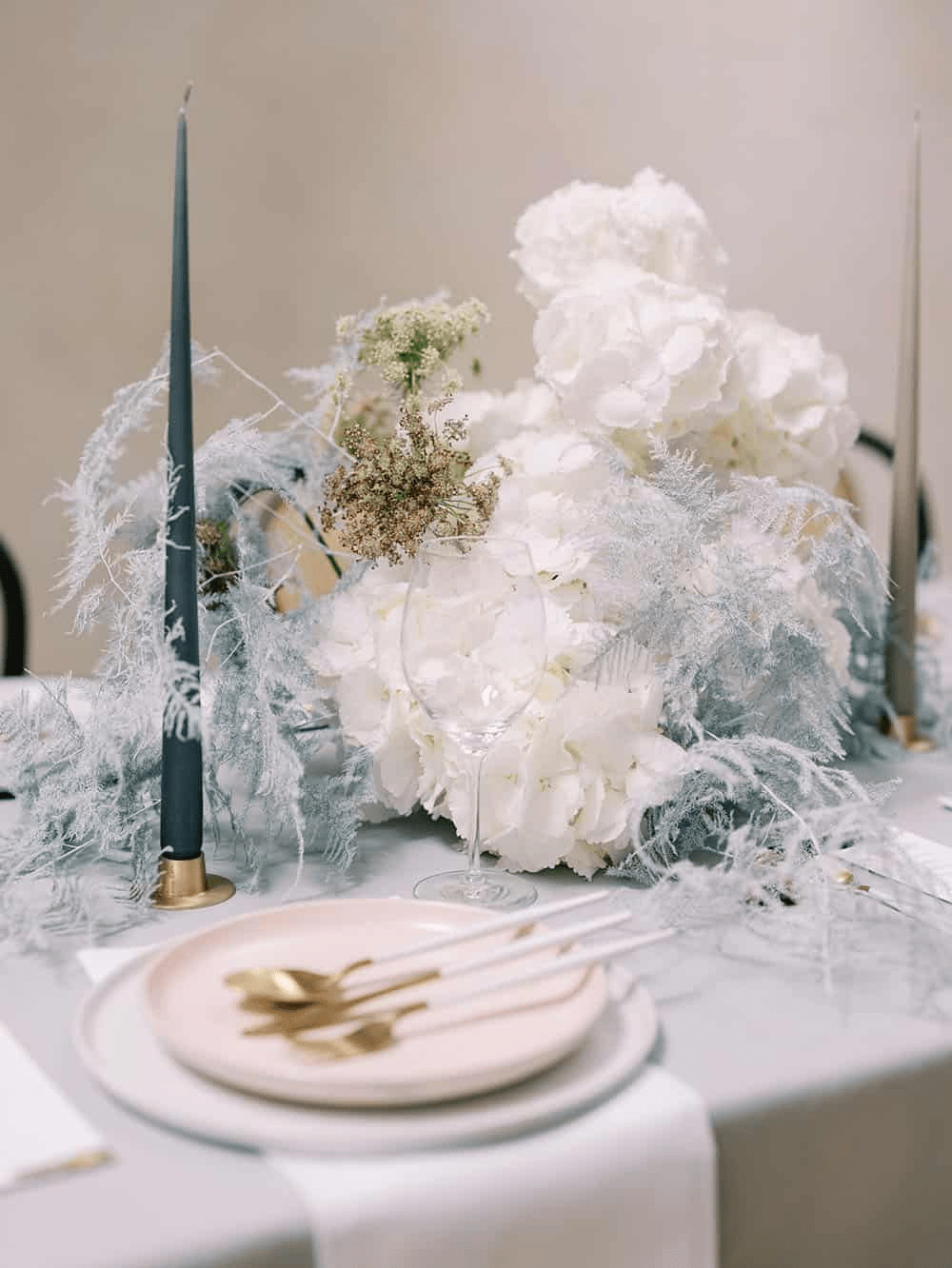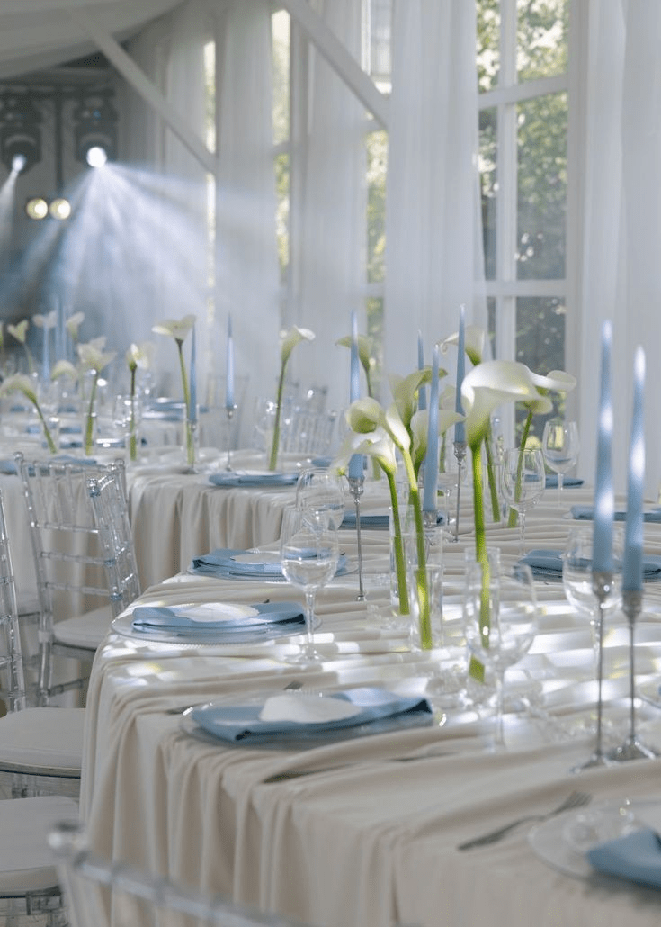 Столи гостей накриваємо тткатертиною айворі, на 1 сторону (по проходу до наречених) створюємо нагромадження з тканинку благородного сіро-блакитного відтінку (у тему хмаринок), згори на драпіровці тканини розмішуємо композицію