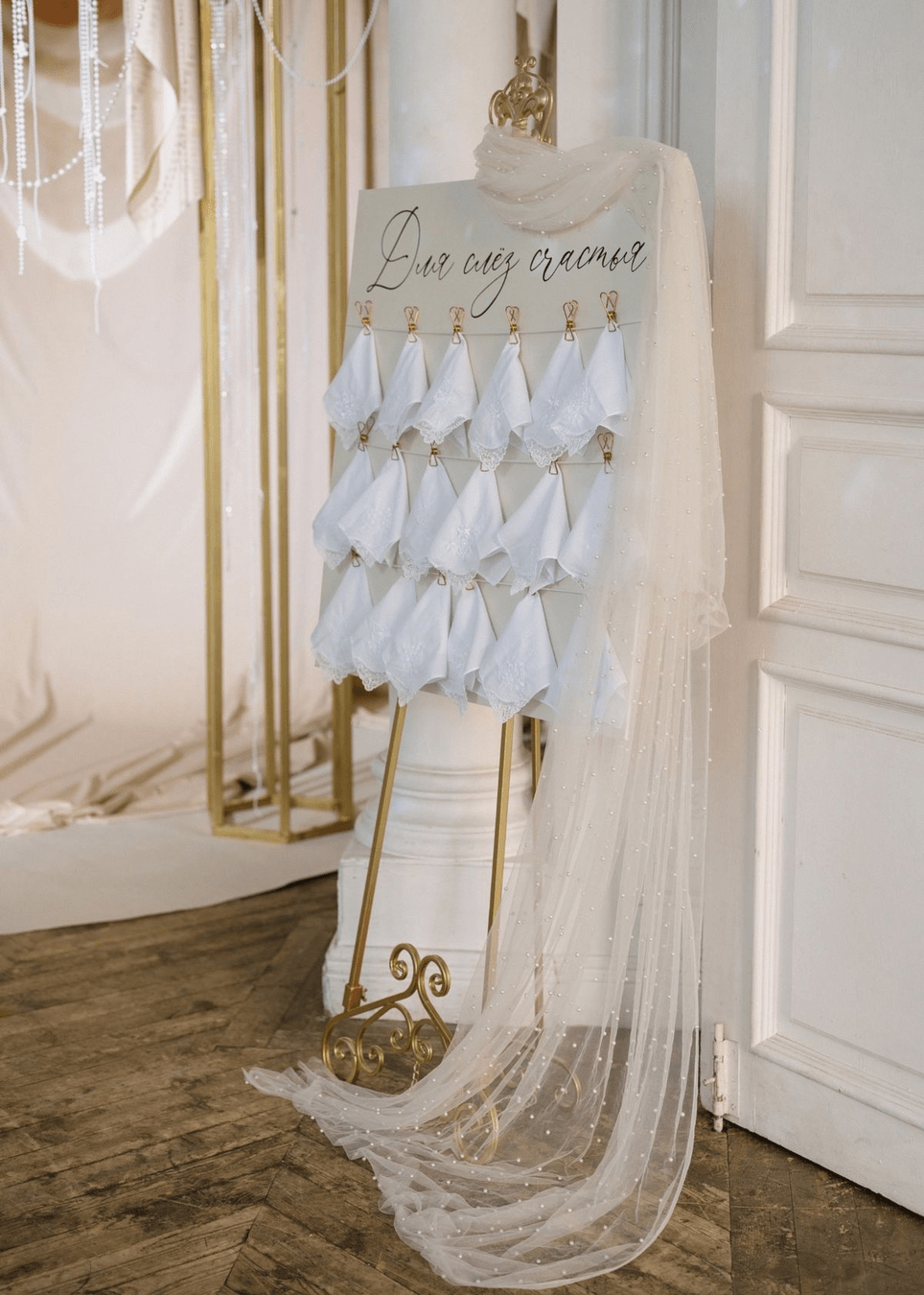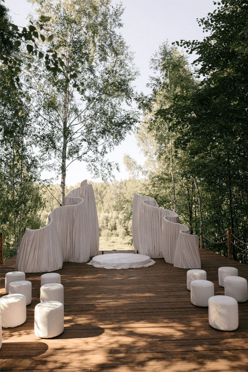 Конструктиви хвильками драпіруються тканинкою молочного/айворі або сіро-блакитного відтінку.