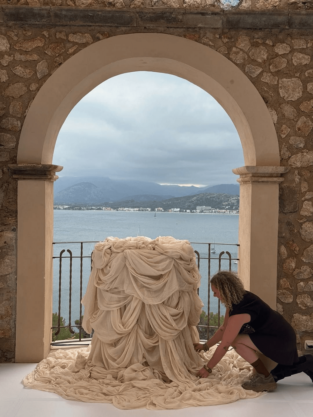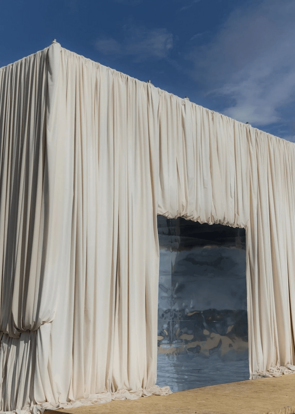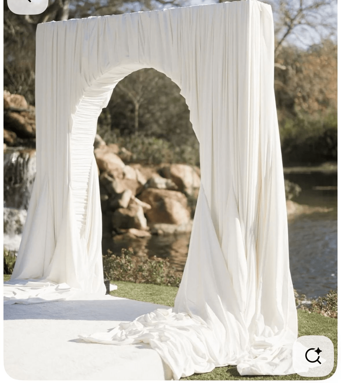 Арка, обмотана тканинкою, подіум- не затягнутий, а вільний, тканина накинута складками.
