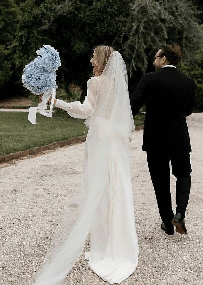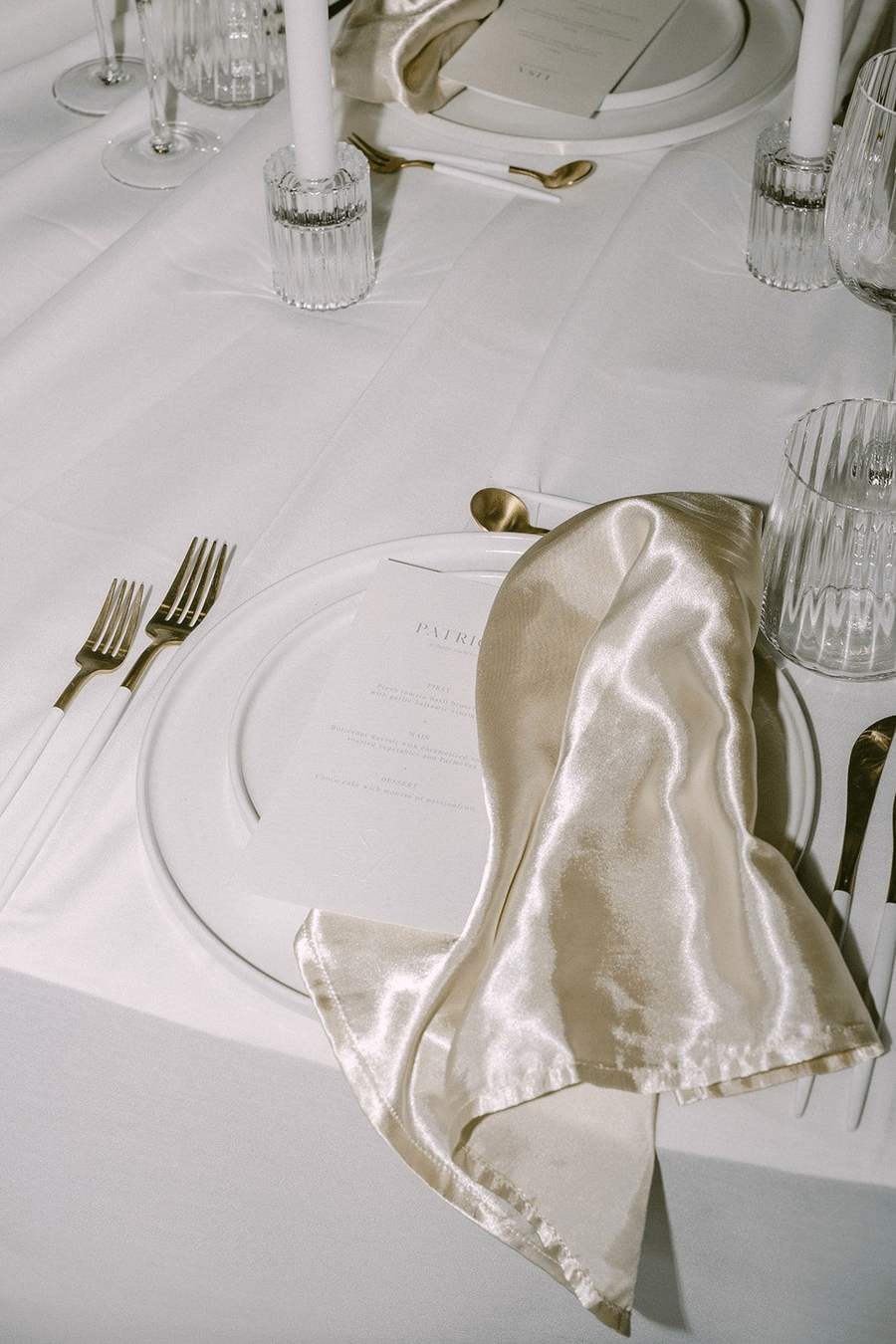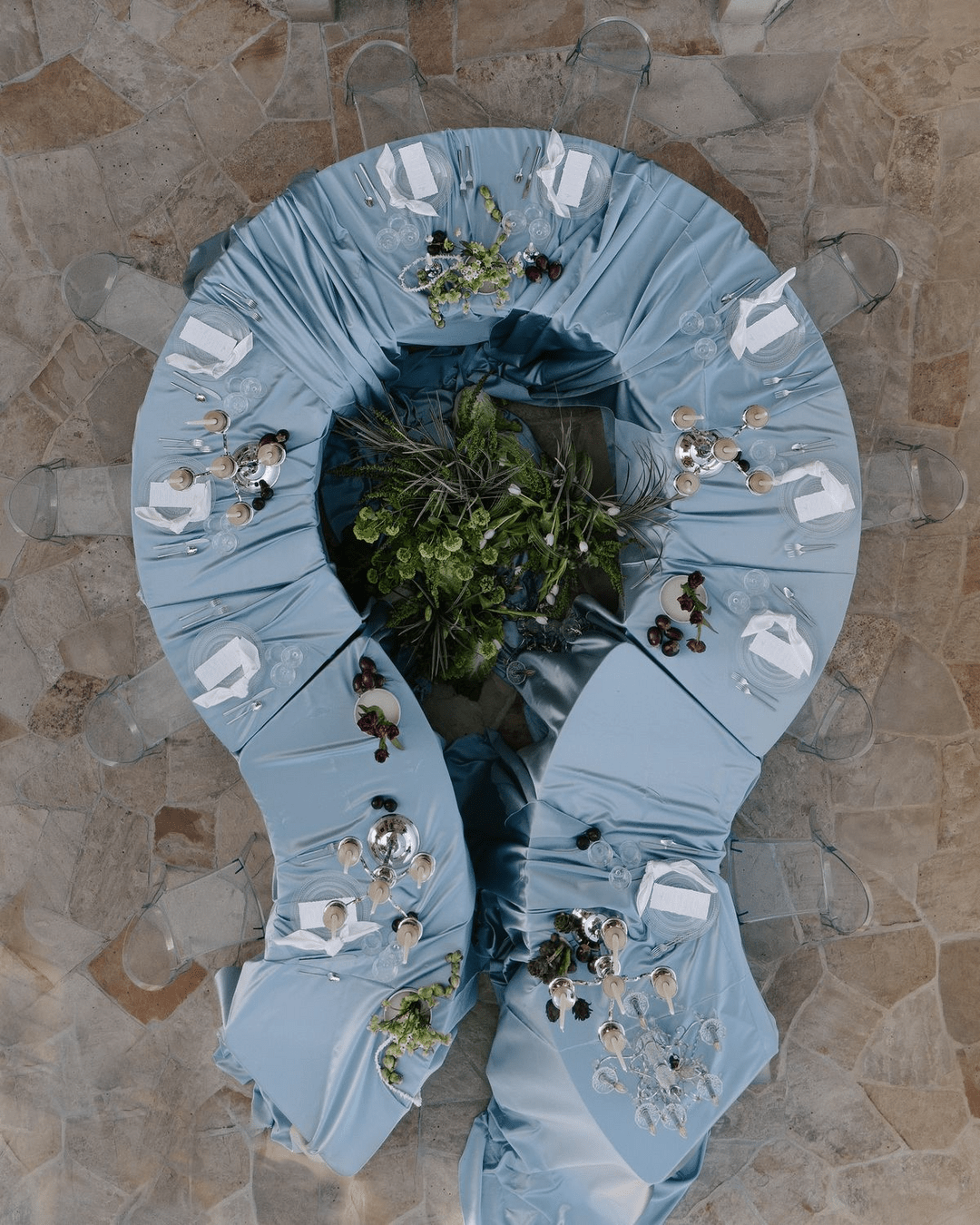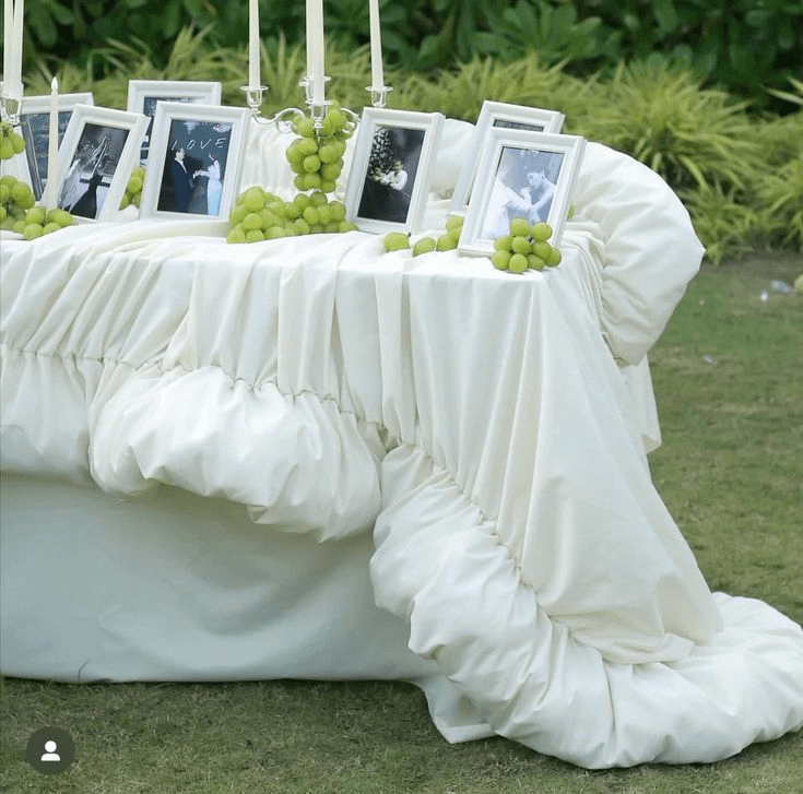 Стіл наречених покриваємо молочною скатертиною та згори задрапіровуємо складочками або нагромадженнями сіро-блакитною як на гостьових столах, щоб створити ''пишний ефект".