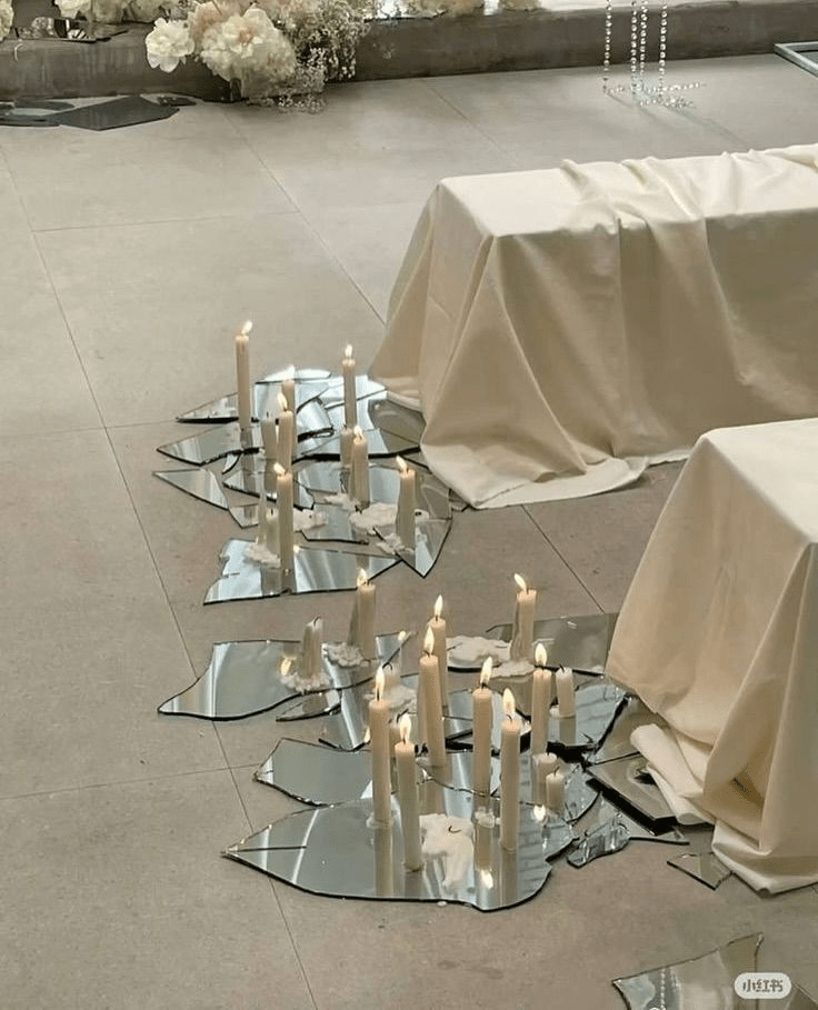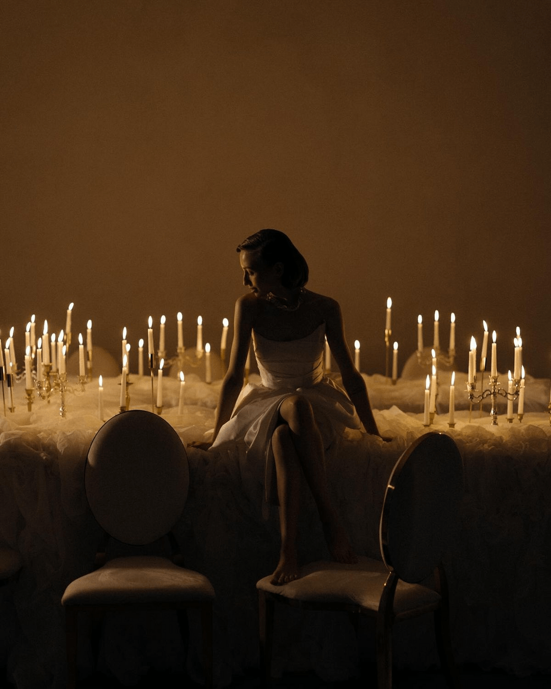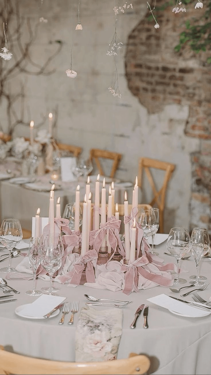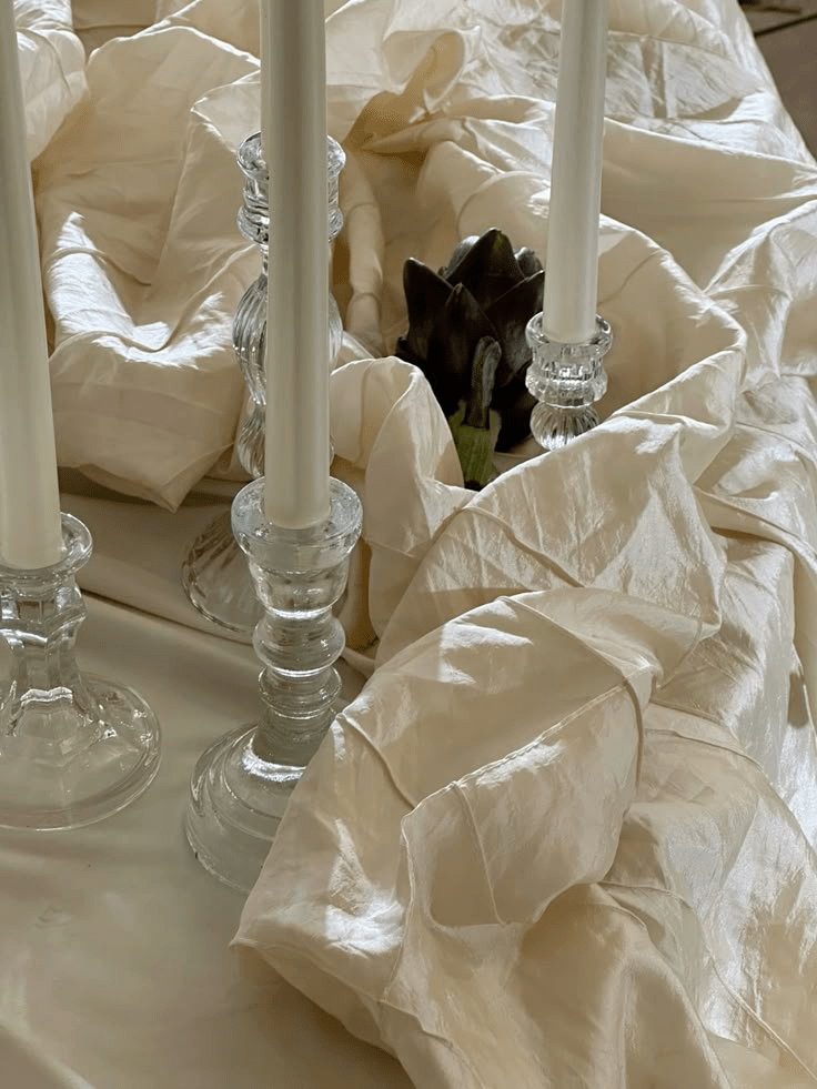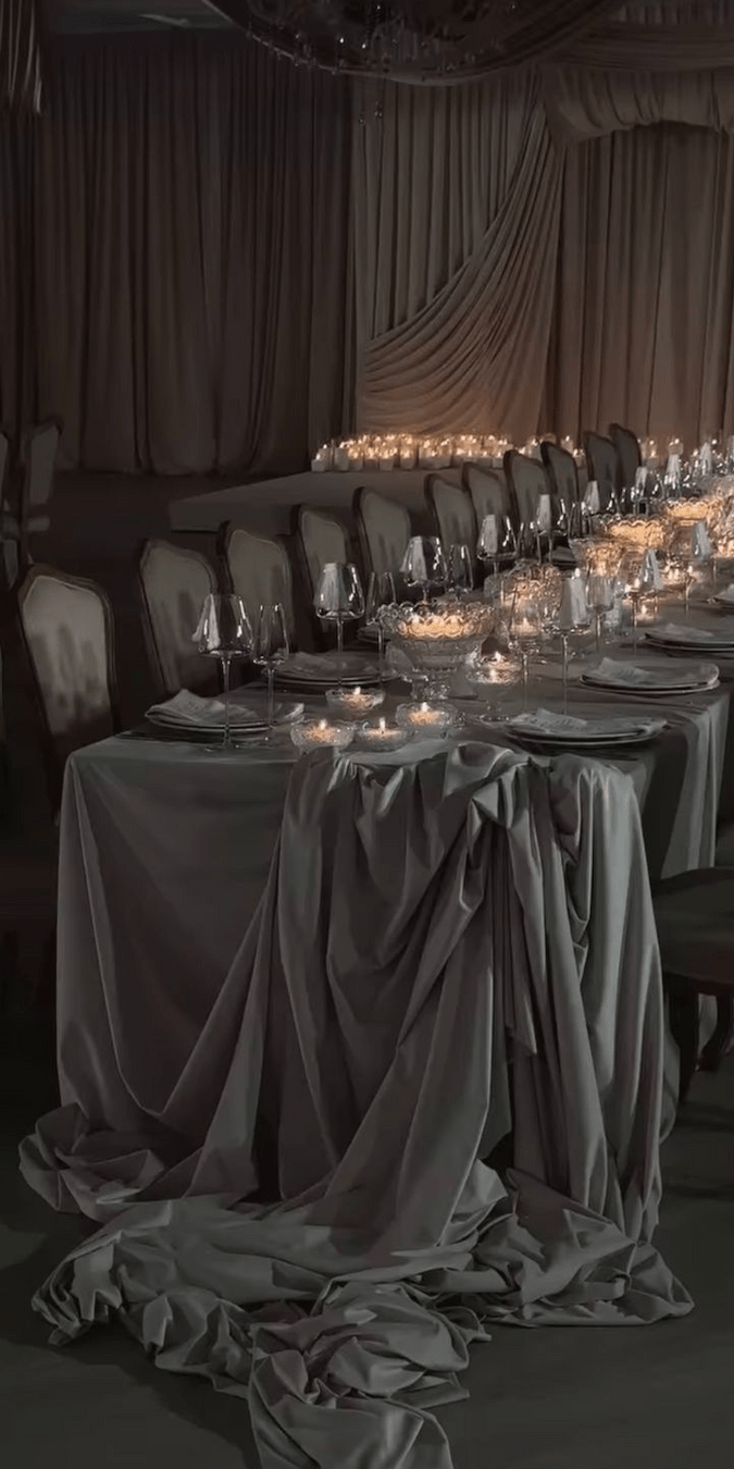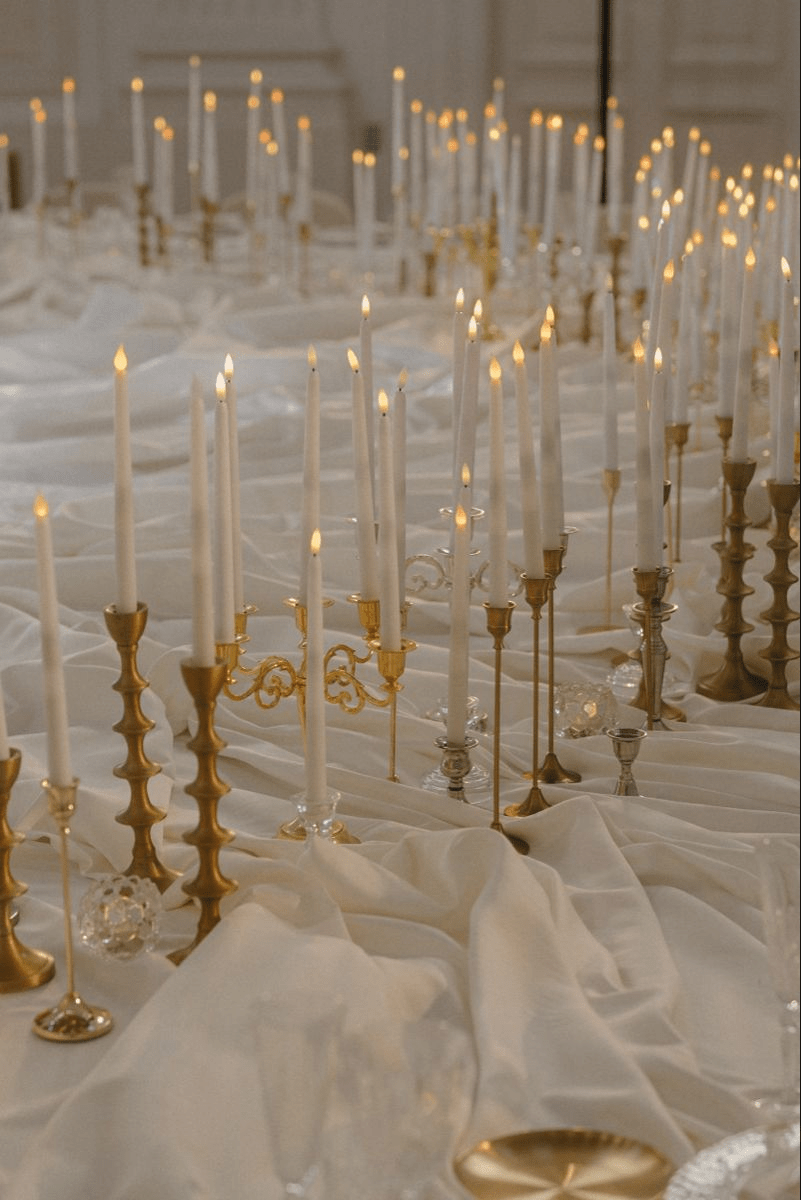 Поверху столу пропонуємо багато свічок у кришталевих підсвічниках танасипний віск у ємностях,як на гостьових столах.