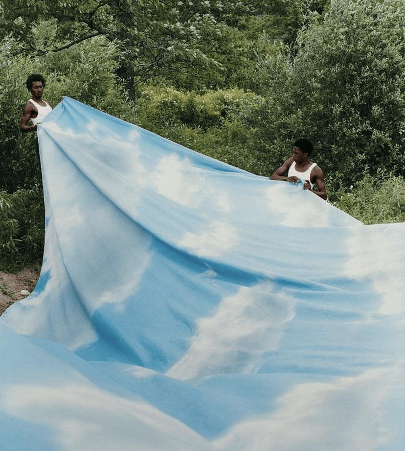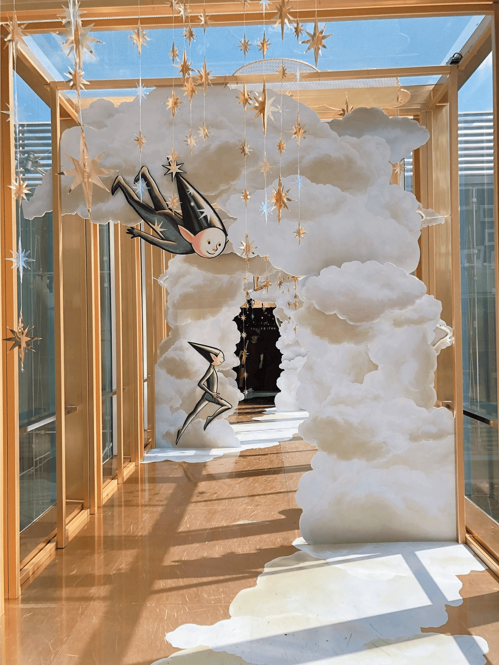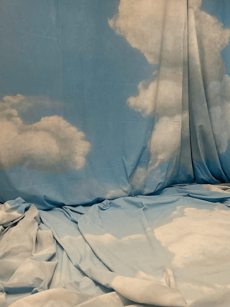 Каркаси, на які кріпляться тканинки розміщуються в об'ємі, по 3 каркаси з кожної сторони. Тканинка задрукувується у зображення хмарок. Подіум робимо однотонним блакитним.