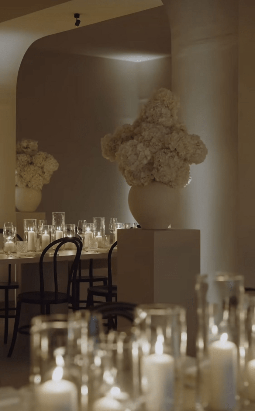 На частині столів на драпіровці тканини можемо зосередити свічки у кришталевих ємностях,