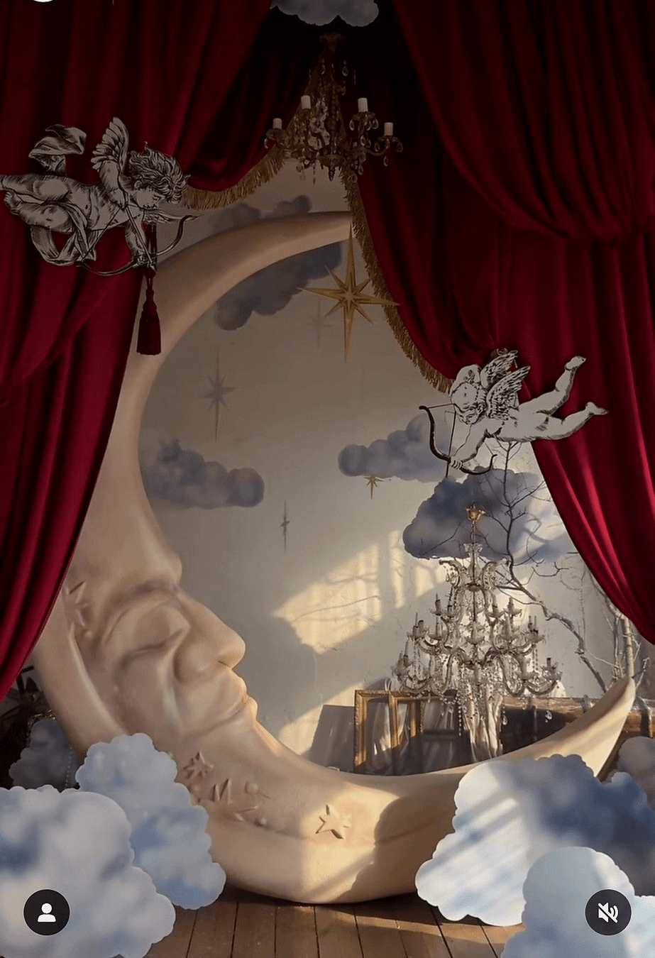 Арка п- подібна затягується тканинкою або вільно тканинка спускається по арці.Ніша задруковується зображенням із хмаринками. Флористика може бути на подіумі купчаста або ж на кубах огорнутих тканинкою