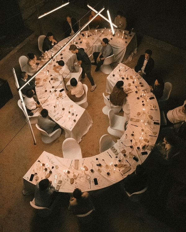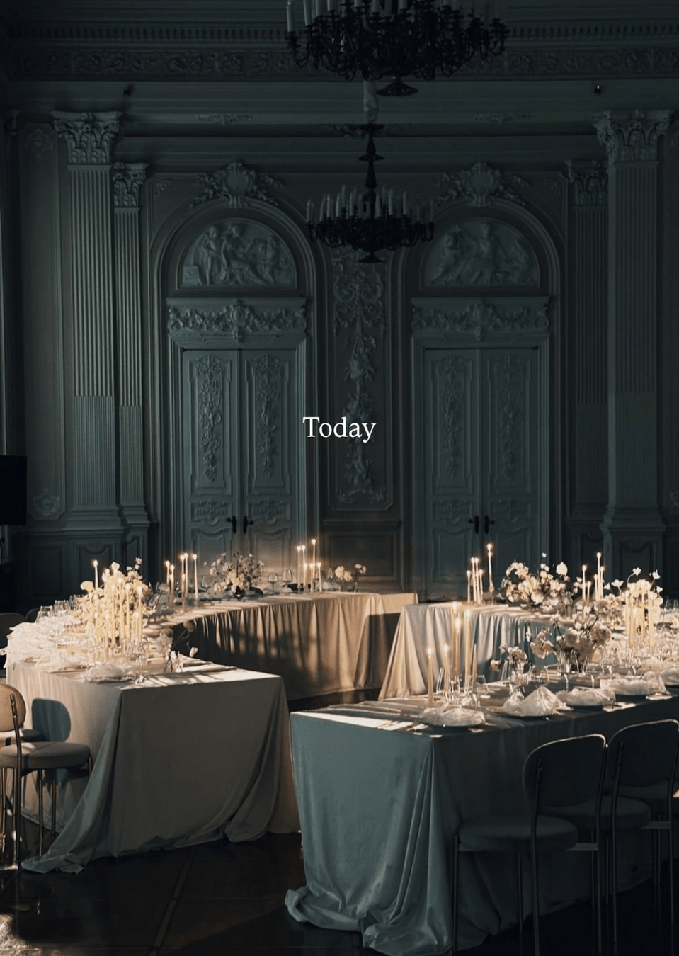 У місцях простору між столами розставляємо куби, накриті тканиною та свічники на них