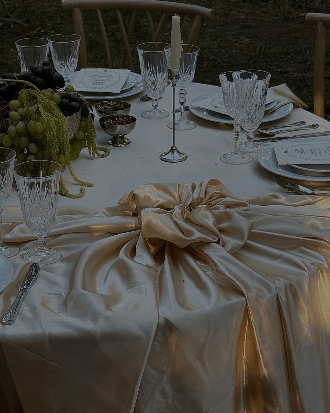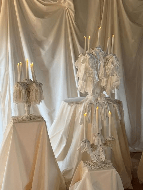 Додатково можемо додати куби, окутані тканинкою як на столі та фоні фотозони, прикрашені свічниками з мереживом