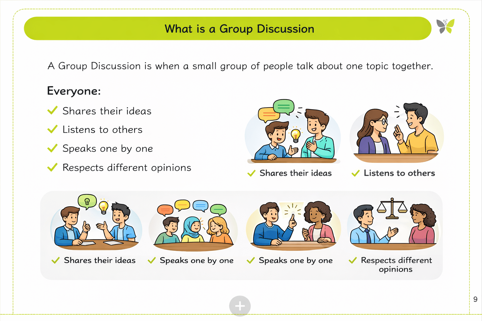 A Group Discussion is when a small group of people talk about one topic together.