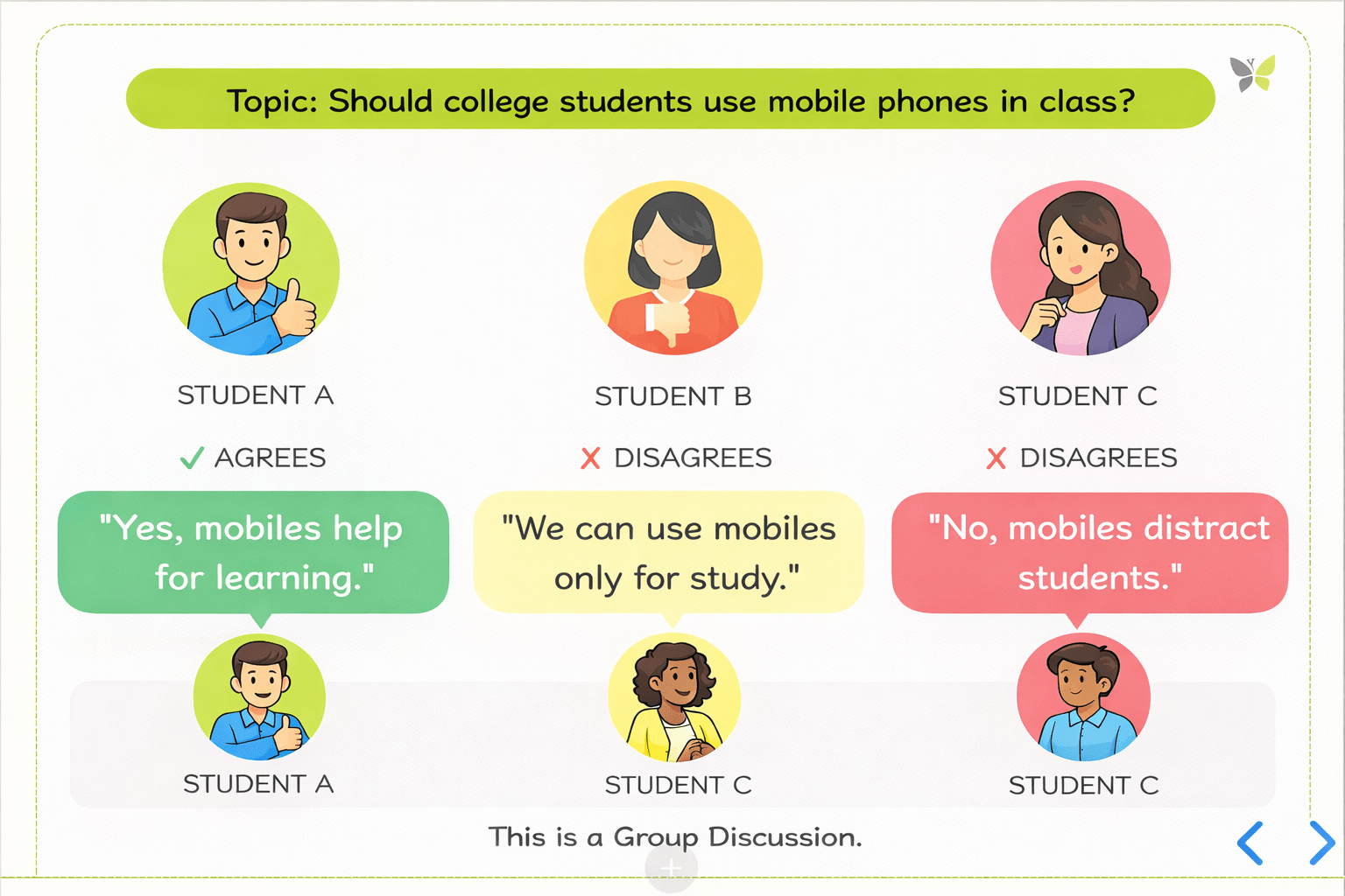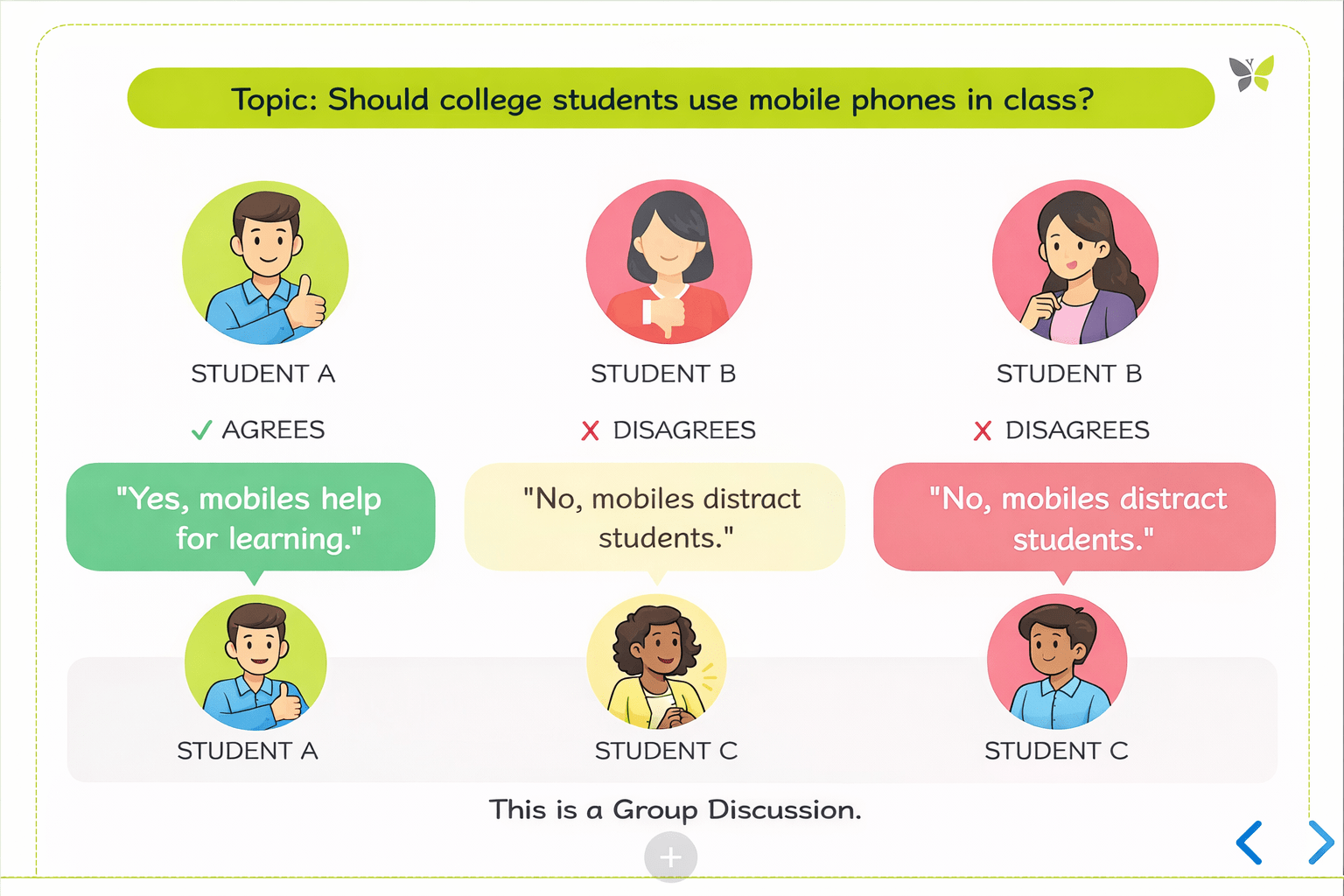 Learners will be able to differentiate between Debate and Group Discussion.
