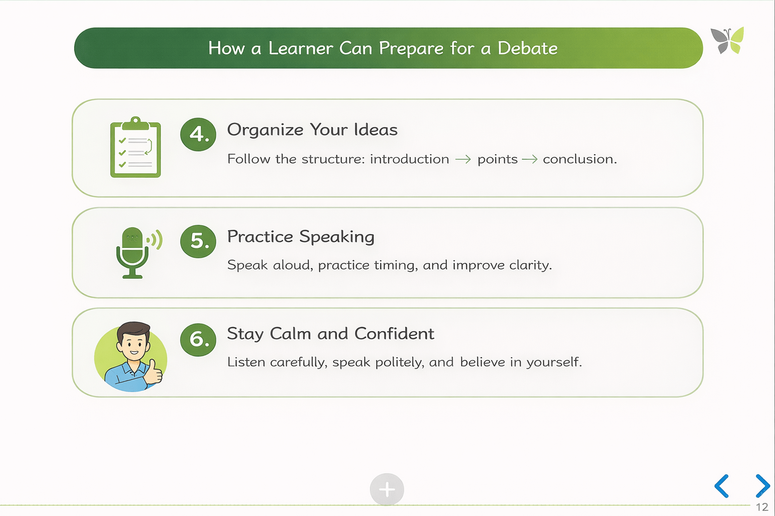 Learners will be able to prepare key points and organize ideas for debates and Group discussions.