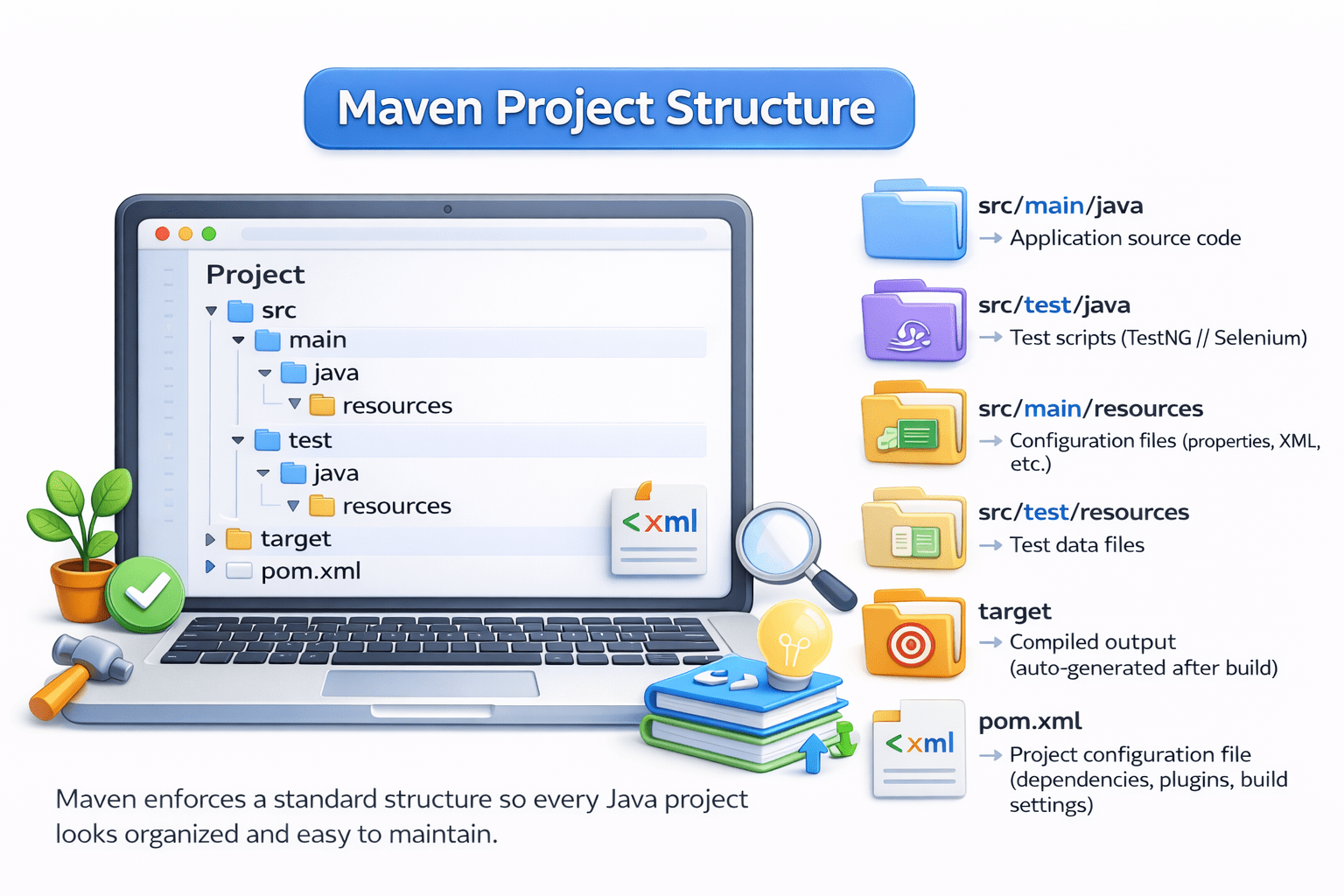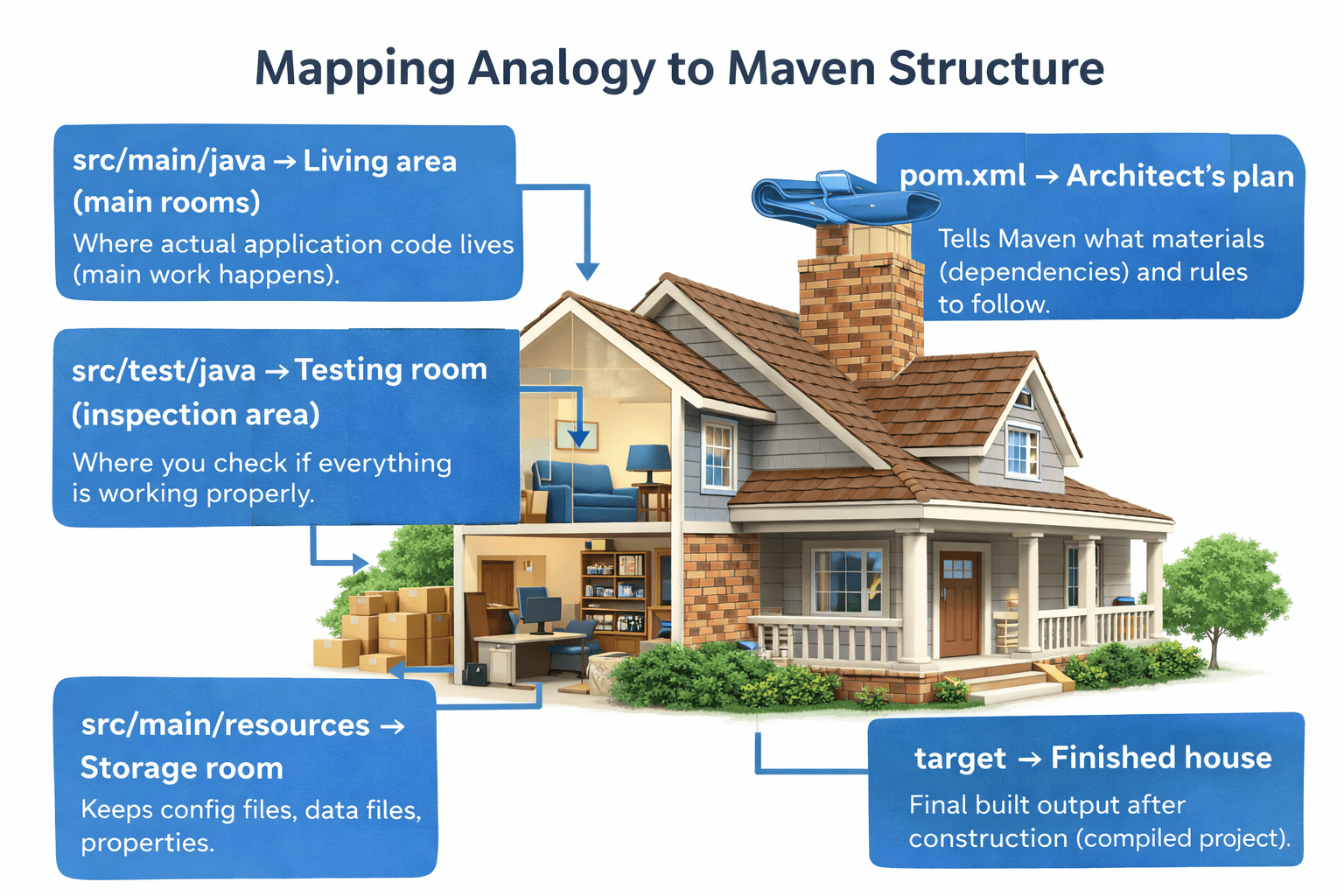 Maven ensures your project is organized like a well-planned house, where every file has a proper place and nothing is scattered randomly.