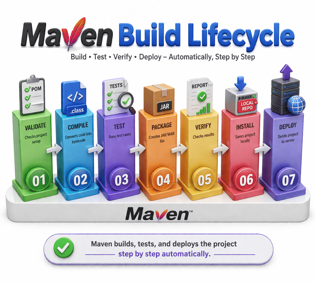 Maven builds, tests, and deploys the project step by step automatically.