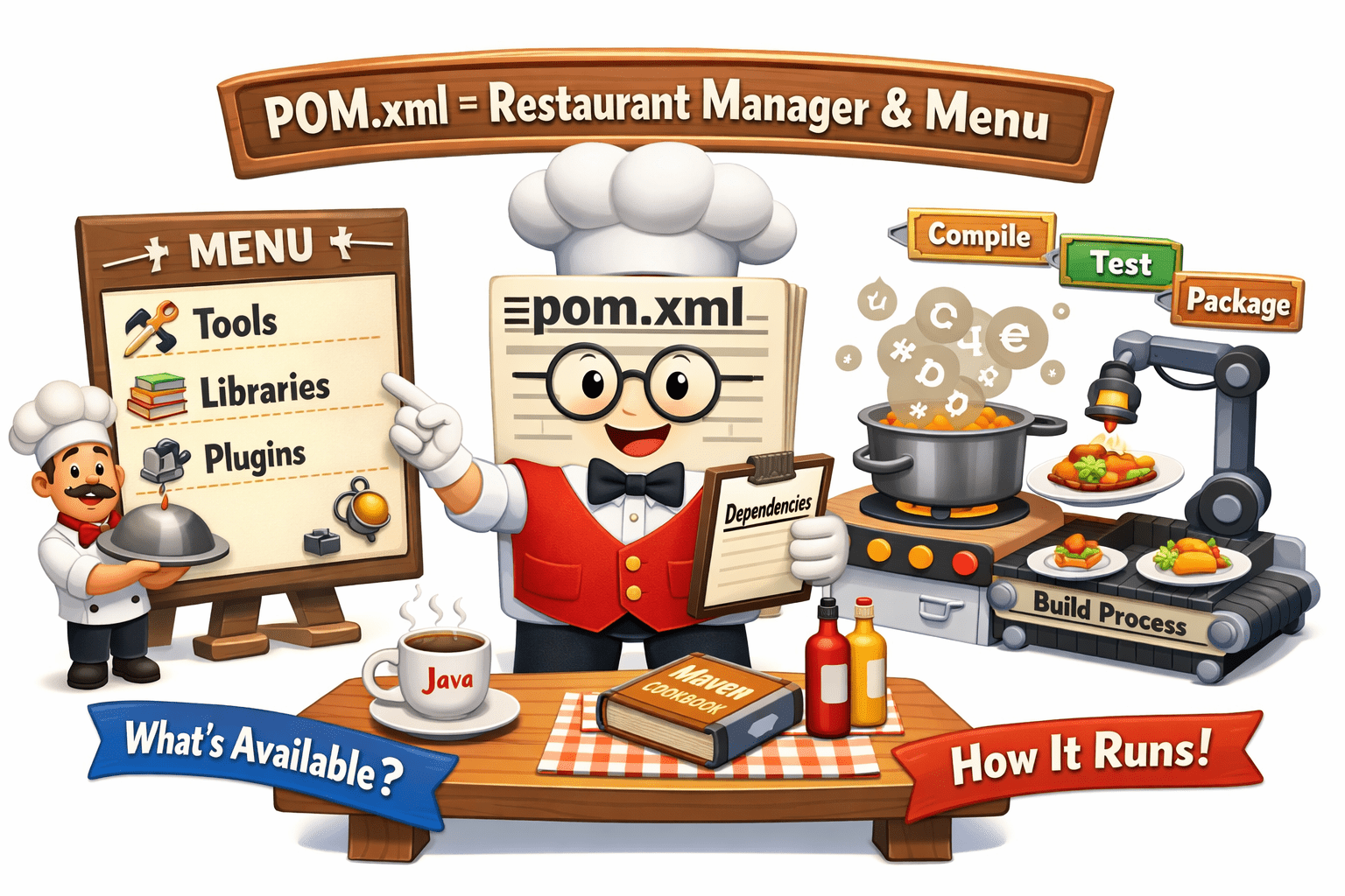 pom.xml is like a smart restaurant manager that decides: