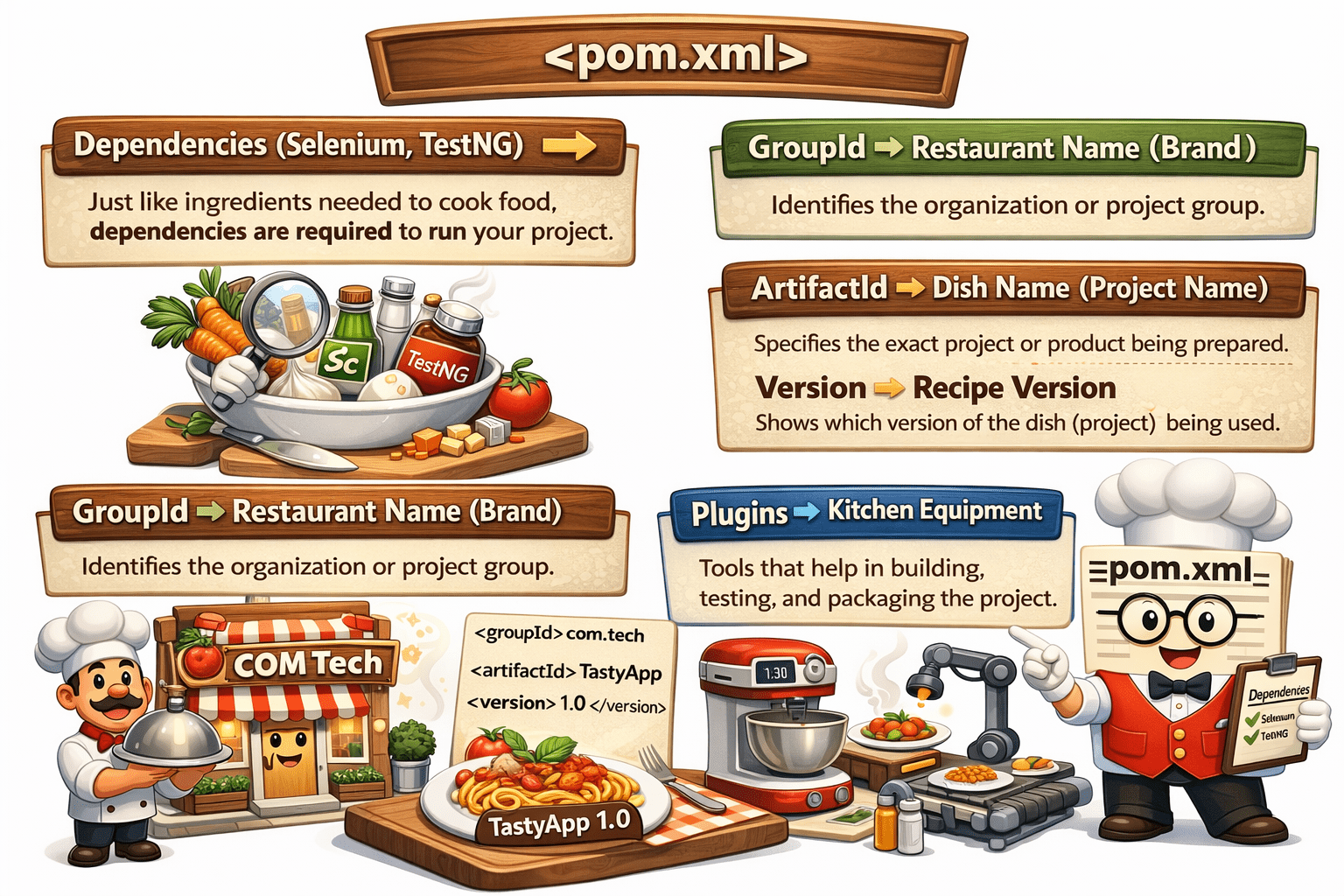 Think of pom.xml as a restaurant menu + manager system