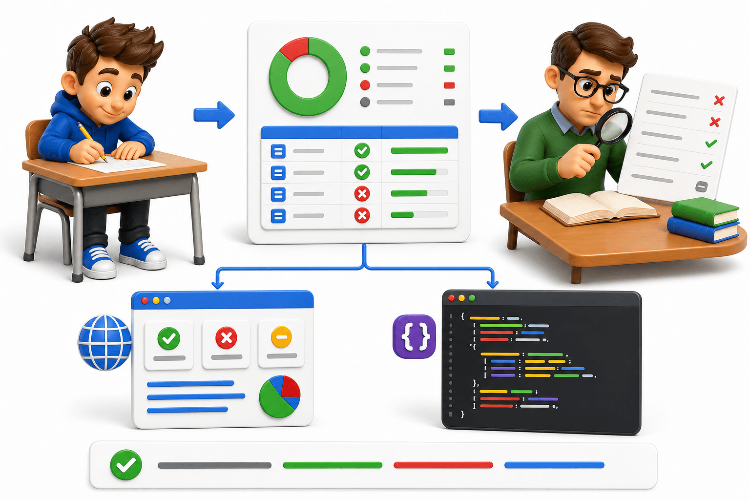 If a student fails, teachers check exactly which question went wrong (error logs/steps).