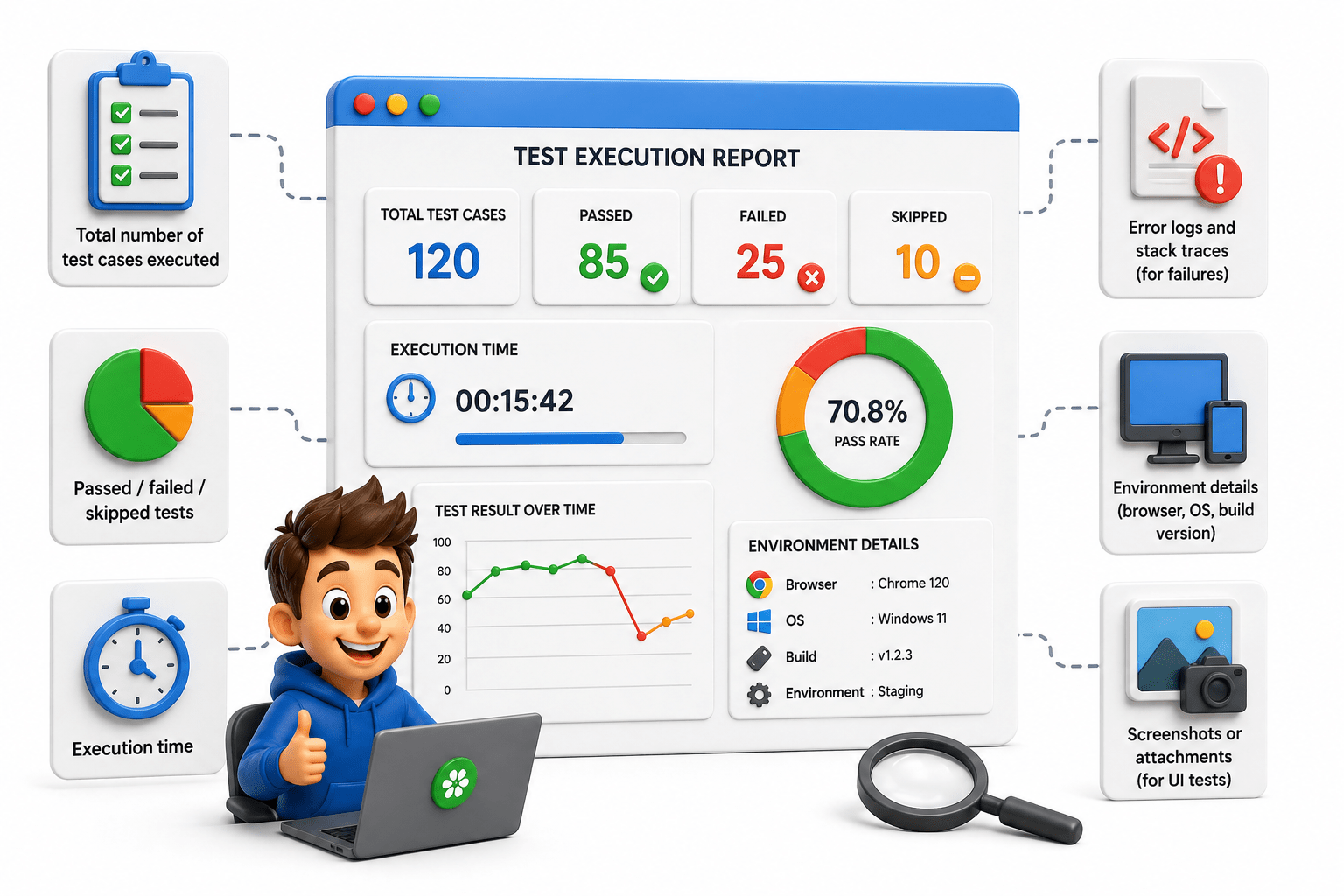A test execution report is a structured document (HTML, JSON, XML, etc.) that summarizes the results of automated or manual test runs.