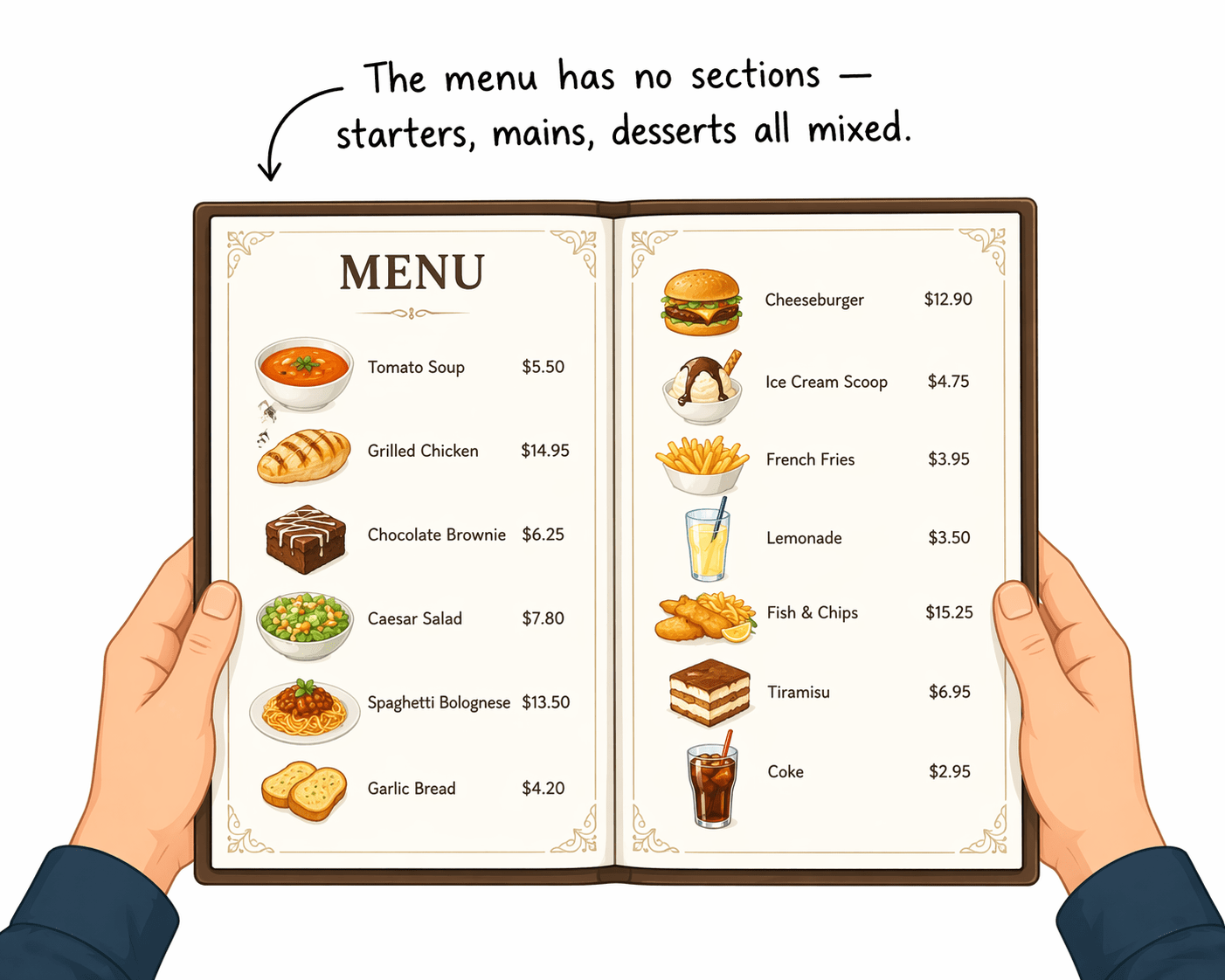 The menu has no sections — starters, mains, desserts all mixed.
