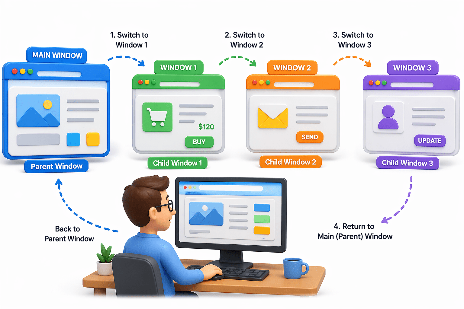 When we have multiple windows in any web application, the activity may need to switch control among several windows from one to other in order to complete the operation After completion of the operation, it has to return to the main window i.e. parent window.