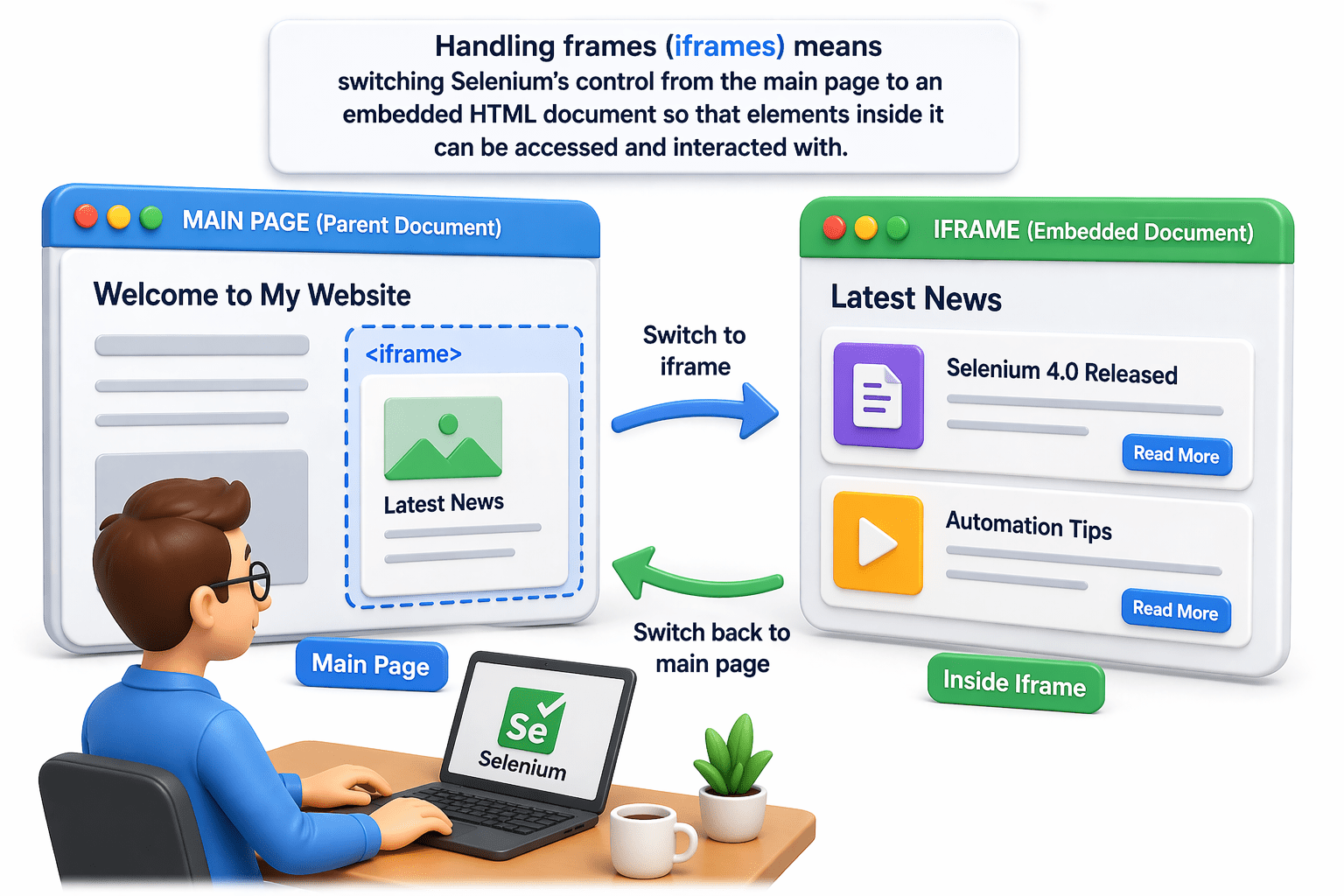 Handling frames (iframes) means switching Selenium’s control from the main page to an embedded HTML document so that elements inside it can be accessed and interacted with.