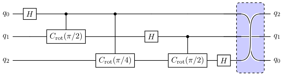 \mathcal{U}_\mathrm{QFT} = \prod_{i=0}^n\big[[\prod_{j=i+1}^nC_\mathrm{rot}(i,j)]H_i\big]\\