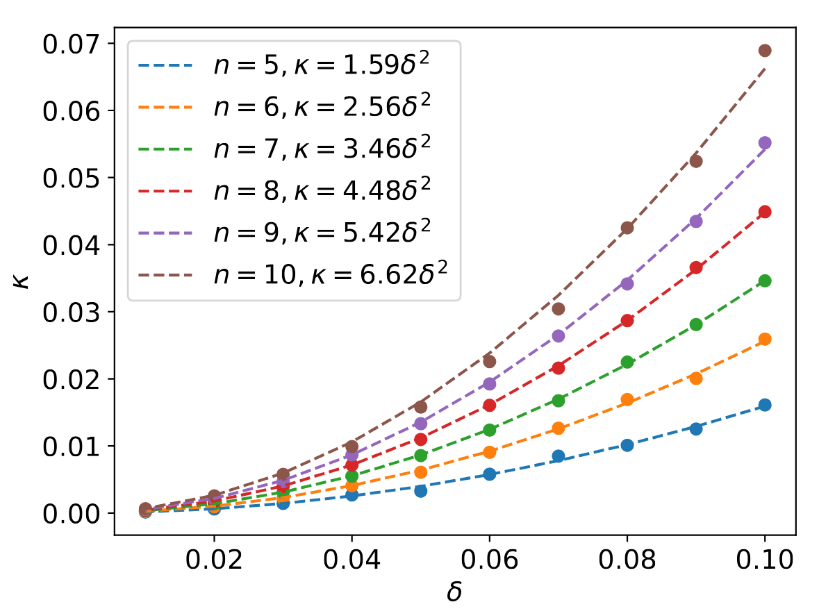 \kappa^*=\frac{2 n (A n+B-C)-2 D}{n-1}\delta^2\ \overset{n\gg1}{\sim} 2An\delta^2